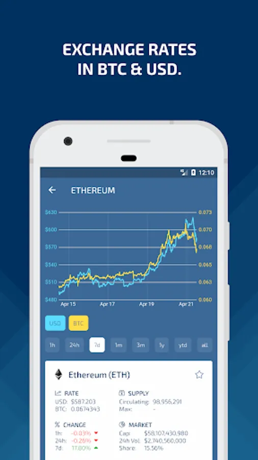 Exchange rate changes are displayed in charts designed for mobile viewing. Set a custom time range and check current and historic rates in both BTC and/or USD or 31 other currencies.