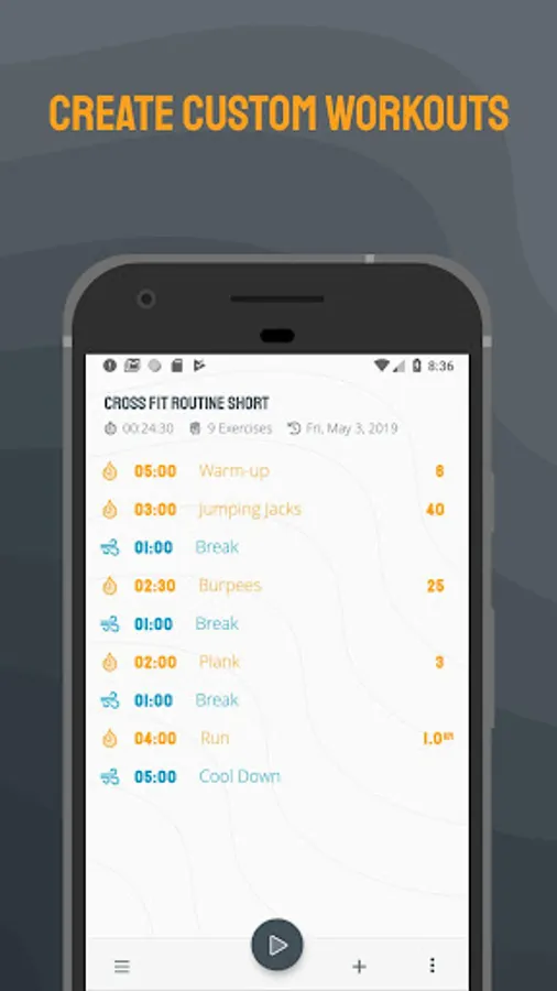 Using Repstack is simple: create your personal workout by stacking timed exercises and breaks that work for you. Set custom repetition or distance for each exercise, and stack as many, or as few as you want. Once you're ready to rock it, hit the play button and Repstack will guide you through your workout, using visuals and sound.