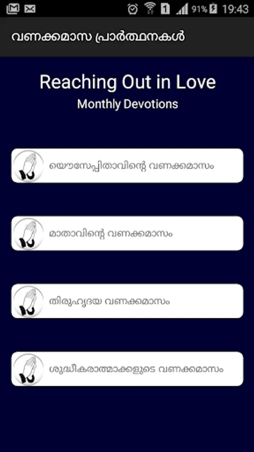 The application includes the traditional Malayalam daily prayers known as Vanakkamaasa Prarthanakal. The version 1.0 has the prayers for the months of March, May, June and November which are dedicated respectively to St. Joseph, Mother Mary, Sacred Heart and Souls in Purgatory.