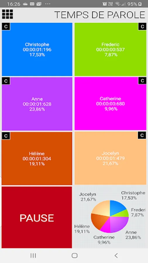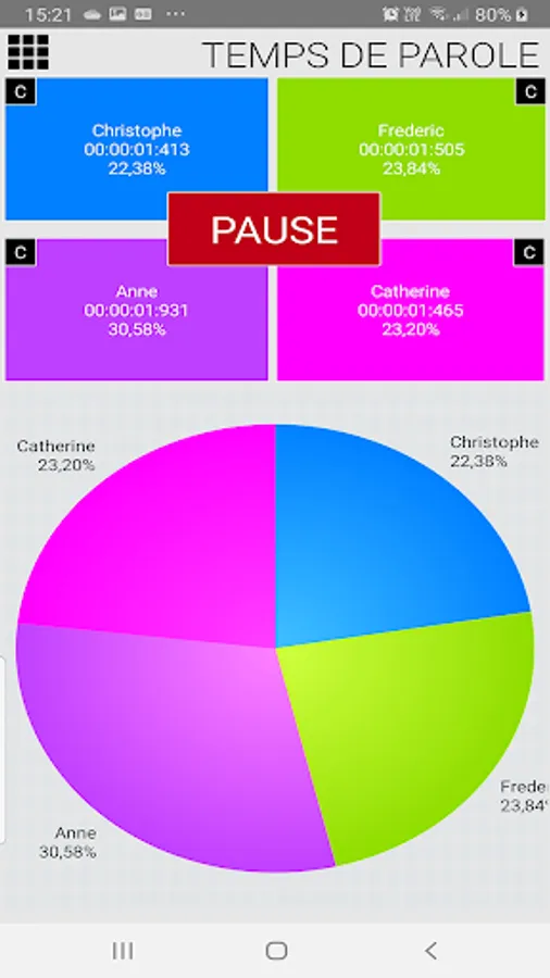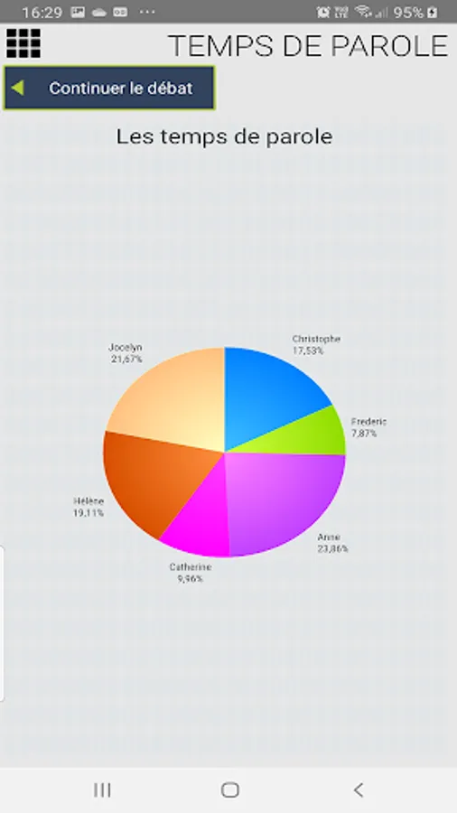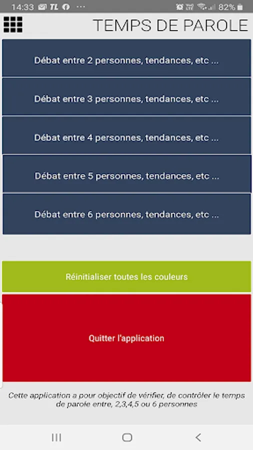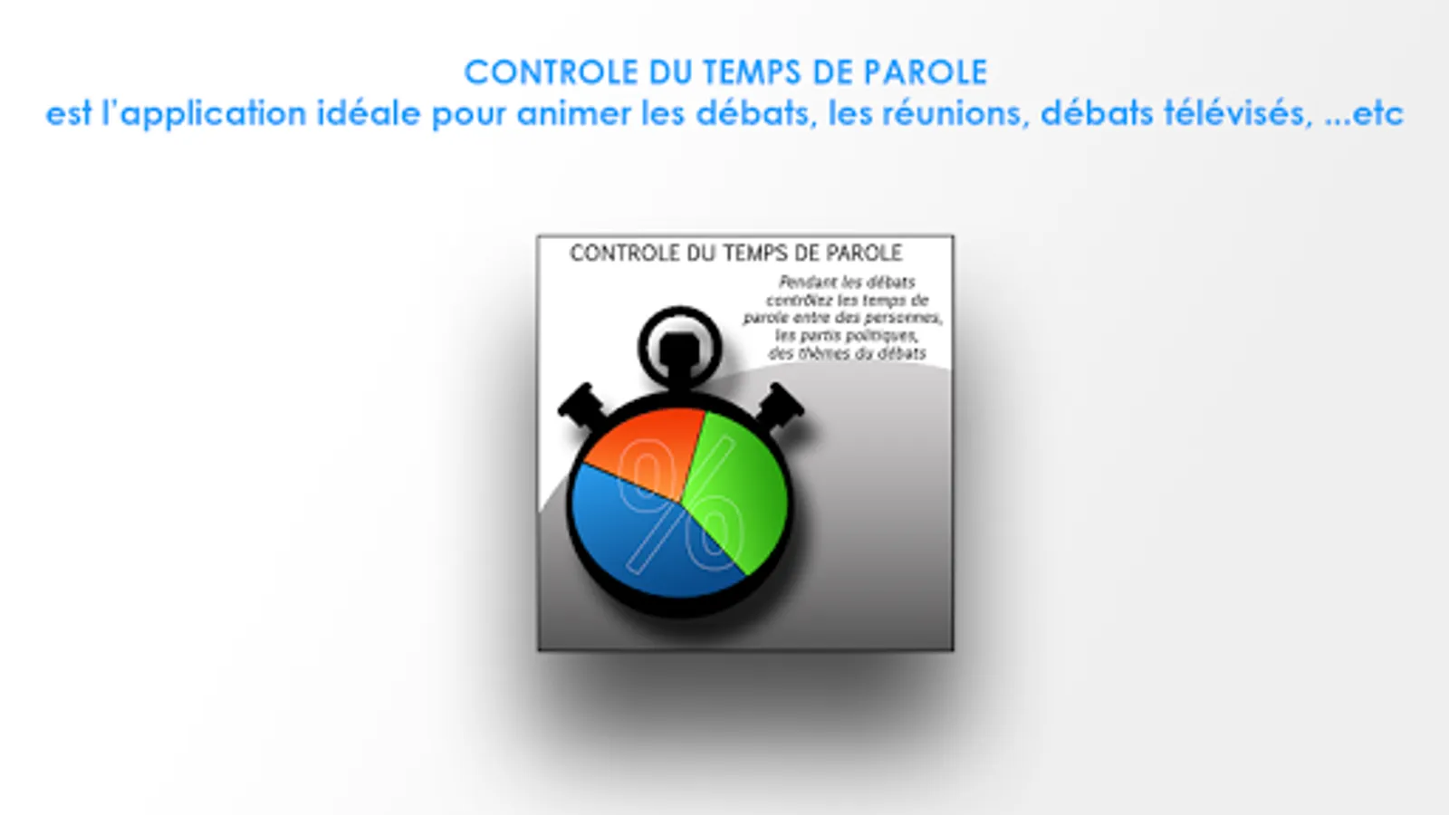 This application allows you to control the speaking time between 2, 3,4,5 or 6 people, trends or political parties.