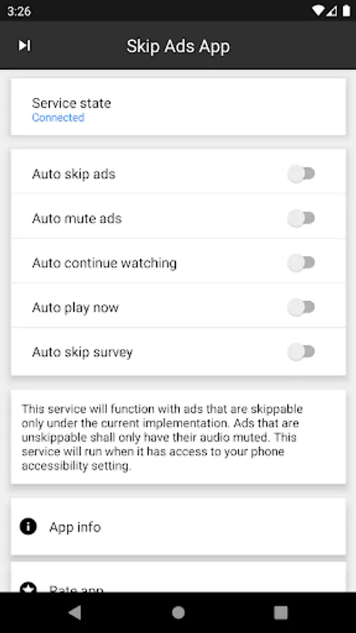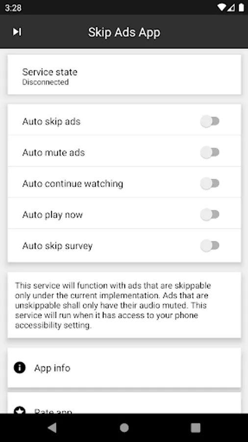 Accessibility permission - Skip Ads App requires access to your phones accessibility setting to function as expected.