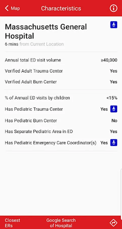 You can also quickly see if ERs are more likely to be prepared to provide emergency care for children, as these ERs are marked with a dark blue baby icon. You can also quickly access information about the % of annual visits from children, if the hospital has a verified pediatric trauma or pediatric burn center, if the ER has a separate pediatric area, and if the ER has pediatric emergency care coordinators.