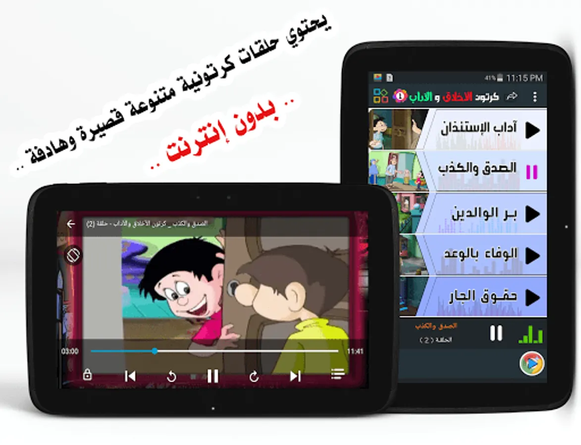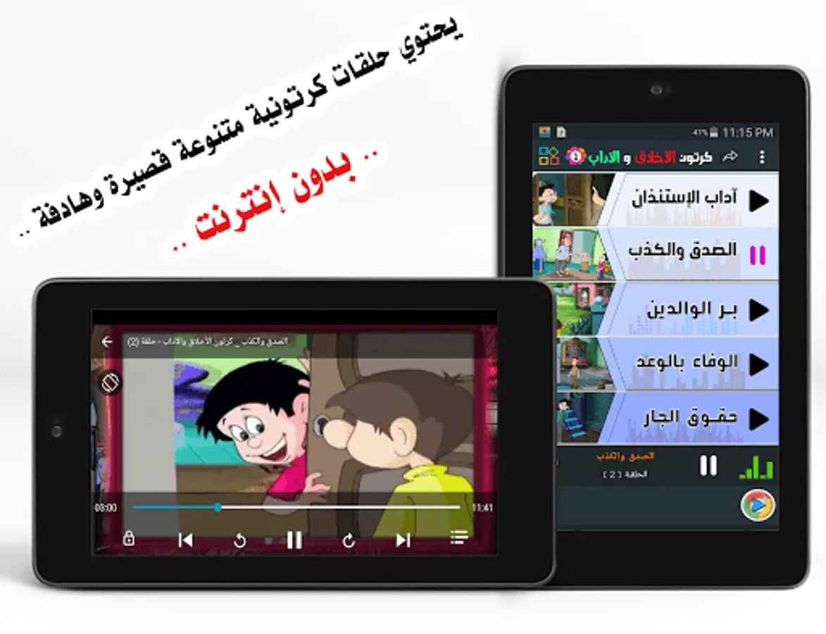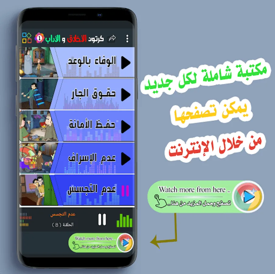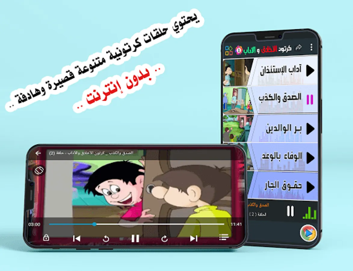 • The application displays YouTube Islamic episodes in cartoon scenes full of colors and attractive sounds, which facilitates teaching morals to children and adults and distinguishing good morals from others.