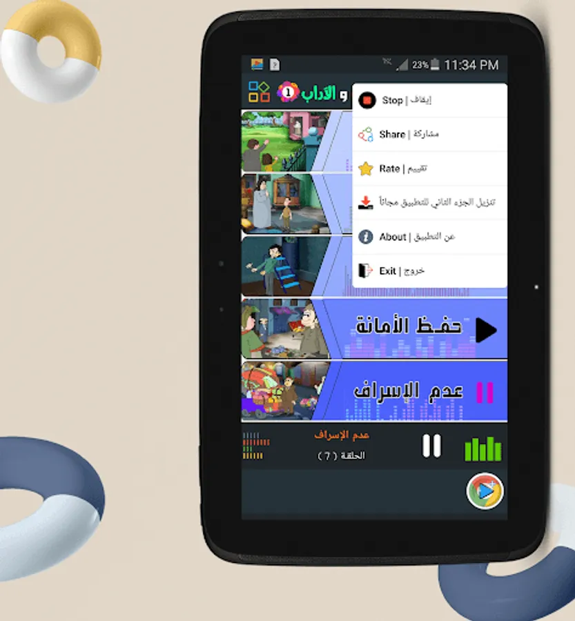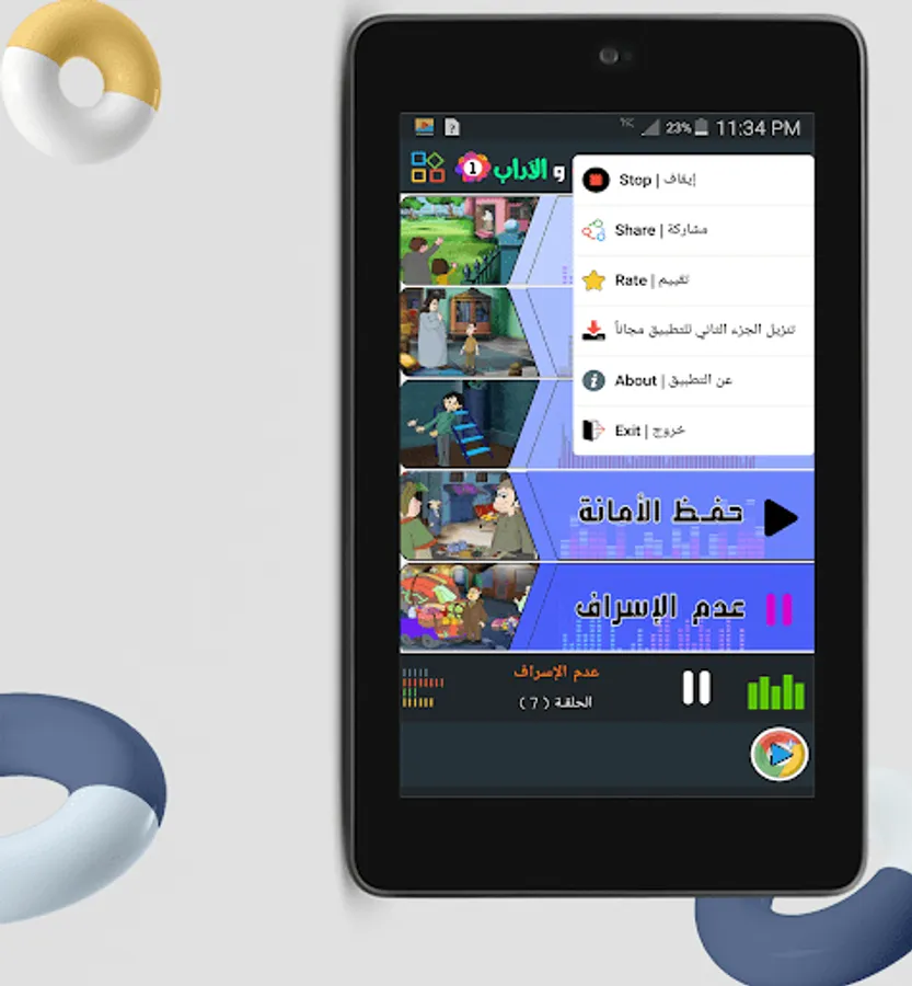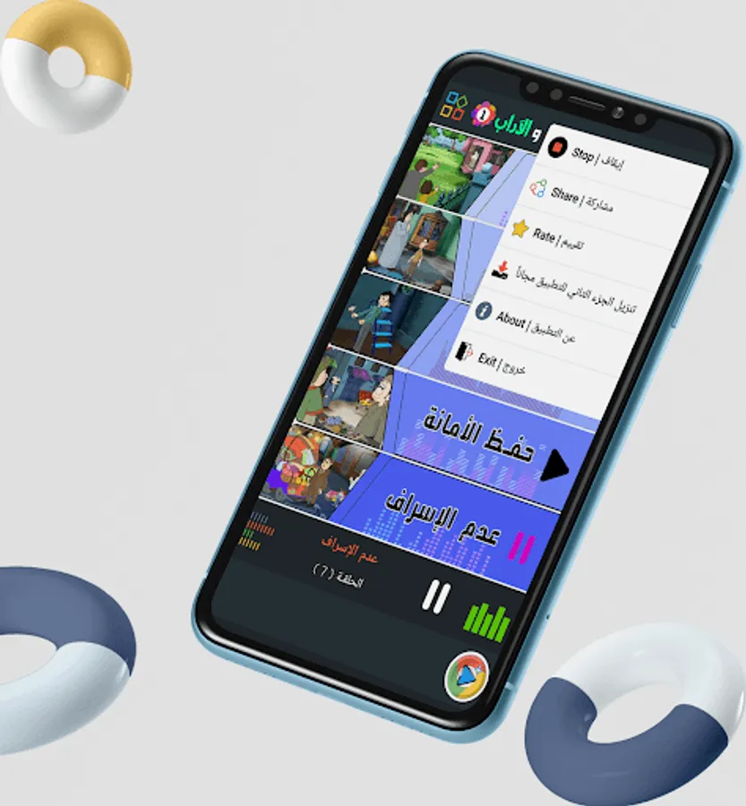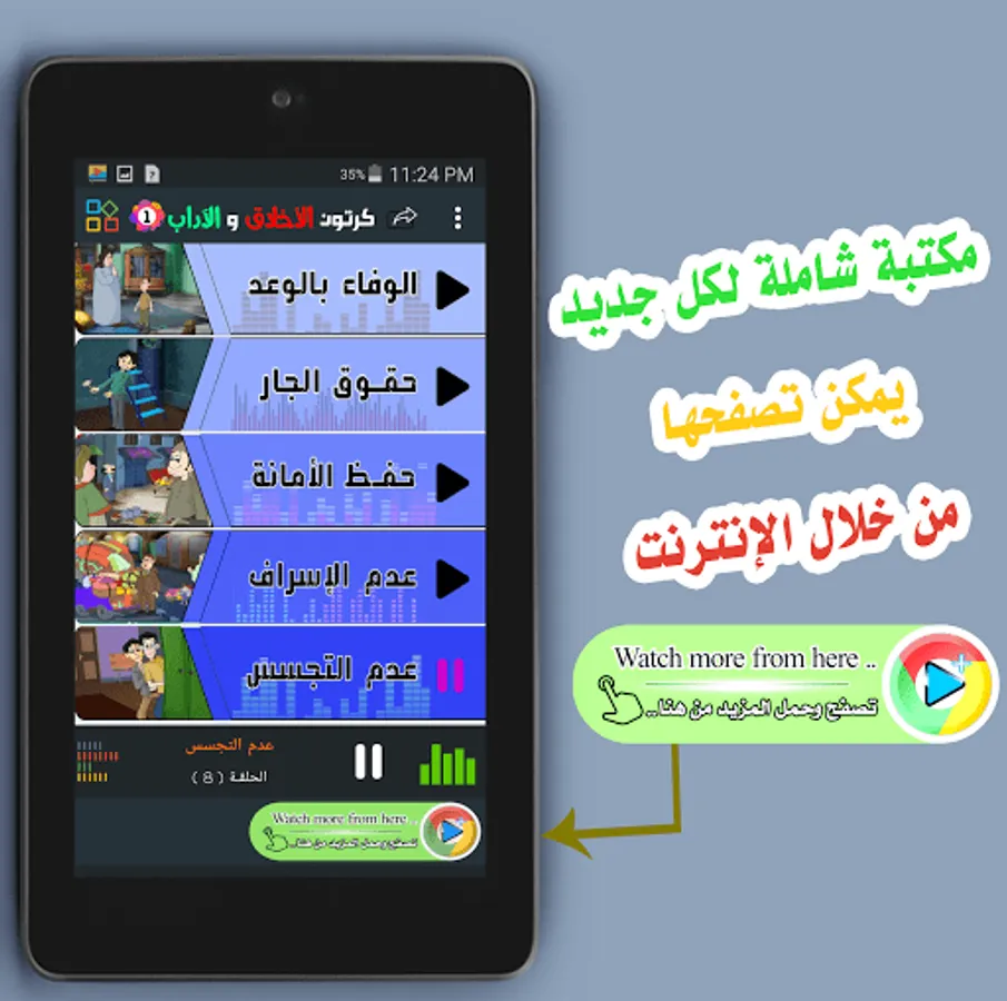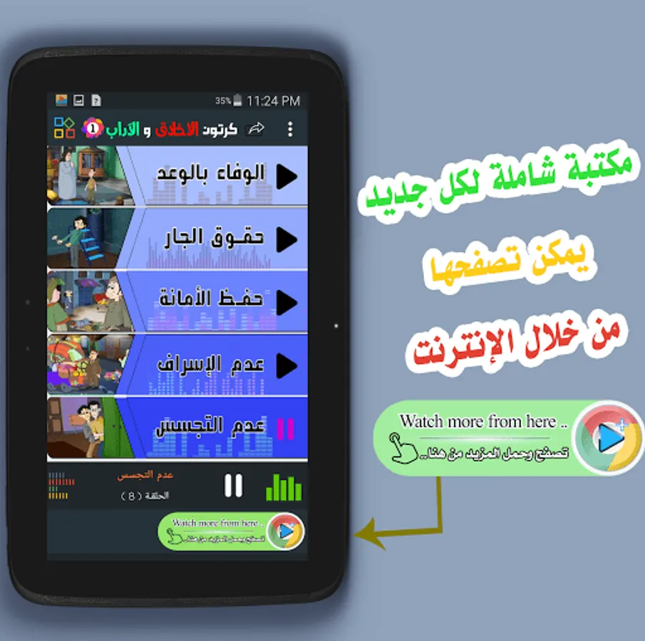 • The application of ethics and manners education provides Islamic religious cartoons to learn about some Islamic morals and manners and some provisions of the Holy Quran and religious teachings such as: