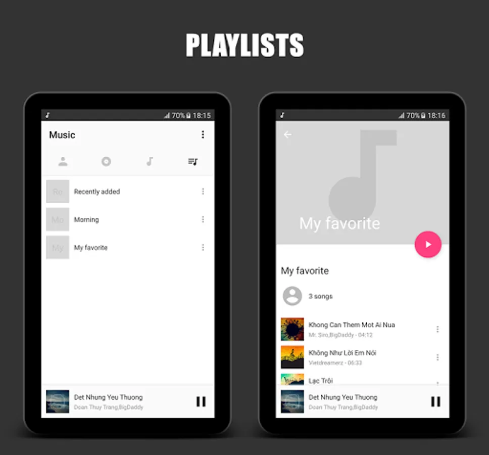 - Custom Playlists : create new, add or remove song, rename your playlist.