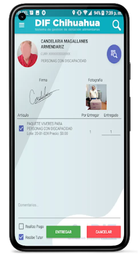 Application that allows managing enrollment and delivery of food grants to beneficiaries affiliated to a program who request food support, operated by a central system that manages and updates synchronized information from each device for better care of the beneficiaries.
