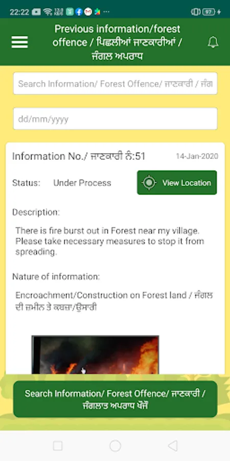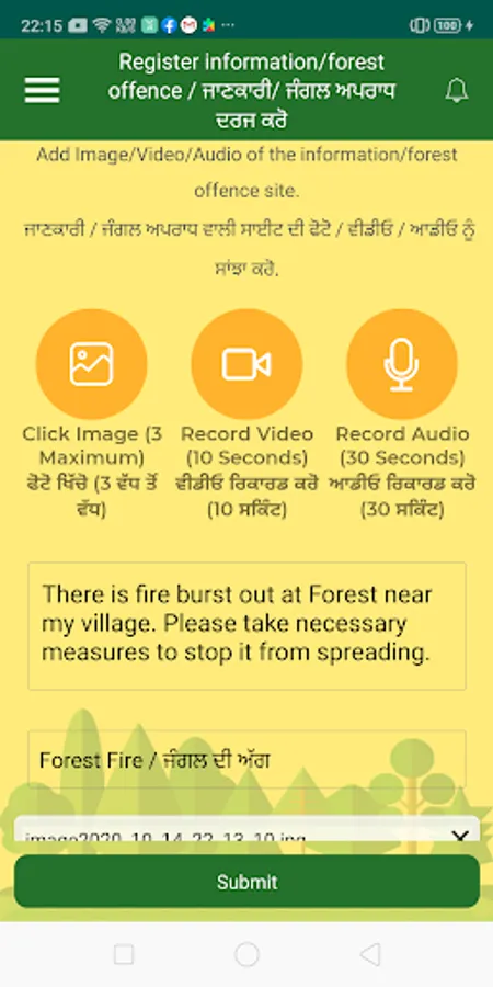 An app to share information regarding forest offenses. Users can download the app and can share us the information if there is any forest offense or fire like incident are happening in their surroundings in the forest area. We'll assign the forest officer of your area to it and get that sorted at the earliest and update you regarding it in the app.