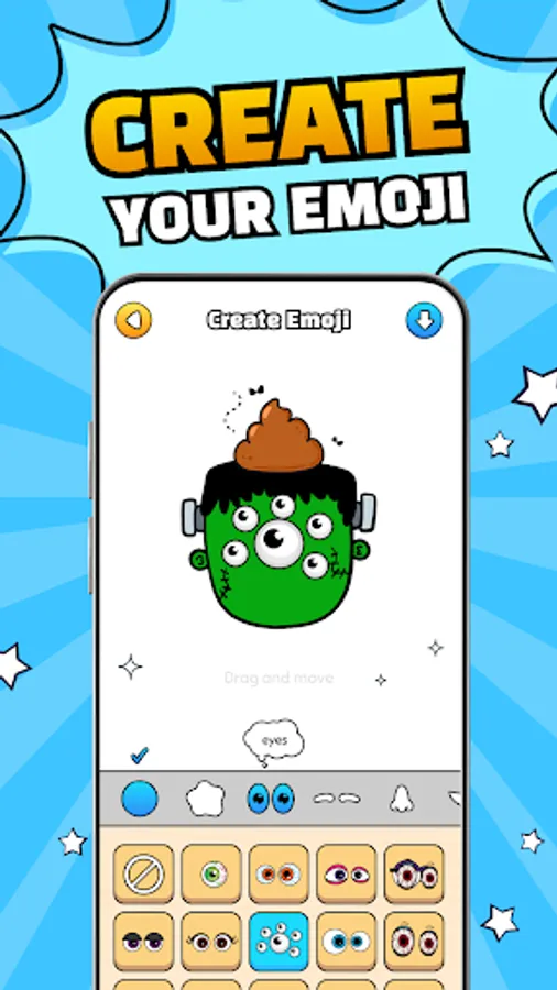 Let’s create a unique and pretty weird emoji in your own style. Use your imagination with creativity to mix face, eyes, mouth, accessoriesn to make your characters more outstanding and fantastic.