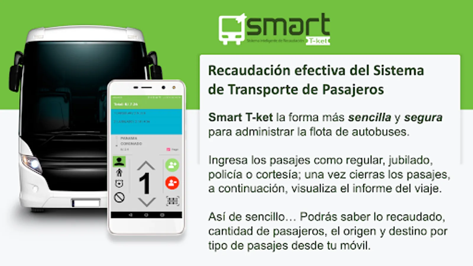 Ask about our Effective Collection service where we integrate the entire bus fleet and the effective supervision of collection. Losses from unreported collection exceeds 30 to 40 percent. Write us at smarttket@gmail.com