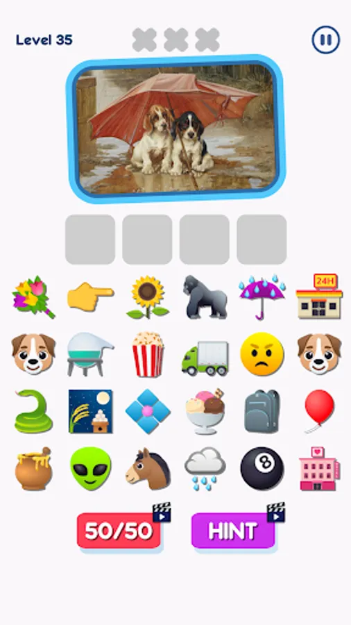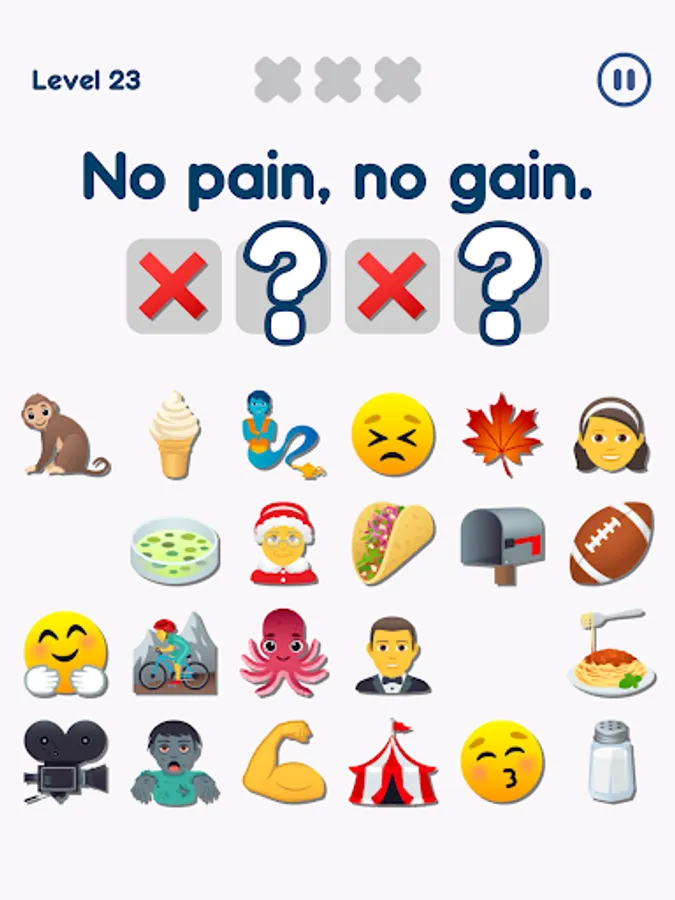 Show off your skills as an emoji interpreter in this supremely fun and frenetic puzzle game where you have to pick the right set of emojis to express the phrase, saying or movie title thatâs written or illustrated above. Solve endless emoji puzzles by matching the right emojis in the right order and sharpen your logic, word association and visual perception skills with hundreds of short, colorful and often hilarious levels of brain-teasing entertainment. đ§© Emoji Guess Puzzle is a simple-in-concept but endlessly challenging and amusing puzzle game for smart players of all ages.