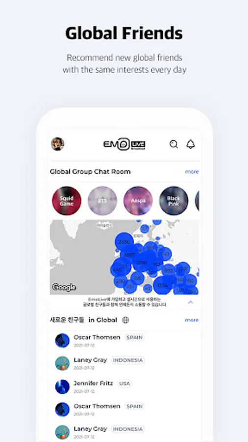 emoLive is automatically translated so that users with different languages can communicate with each other in real time in the service area of chatting, video call, and live broadcasting.