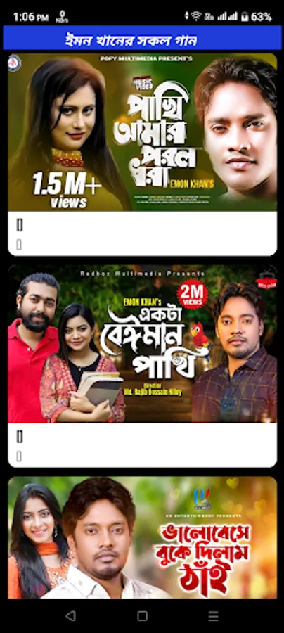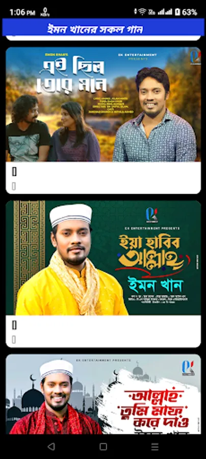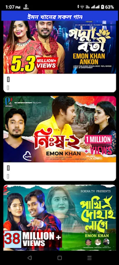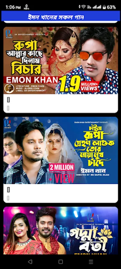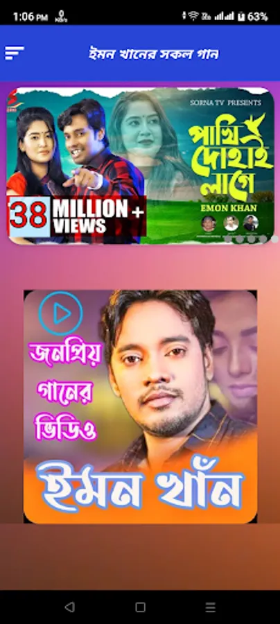 আমাদের এই আপে জনপ্রিয় কণ্ঠশিল্পী ইমন খানের সকল ভিডিও গান উপভোগ কোরতে পারবেন ।