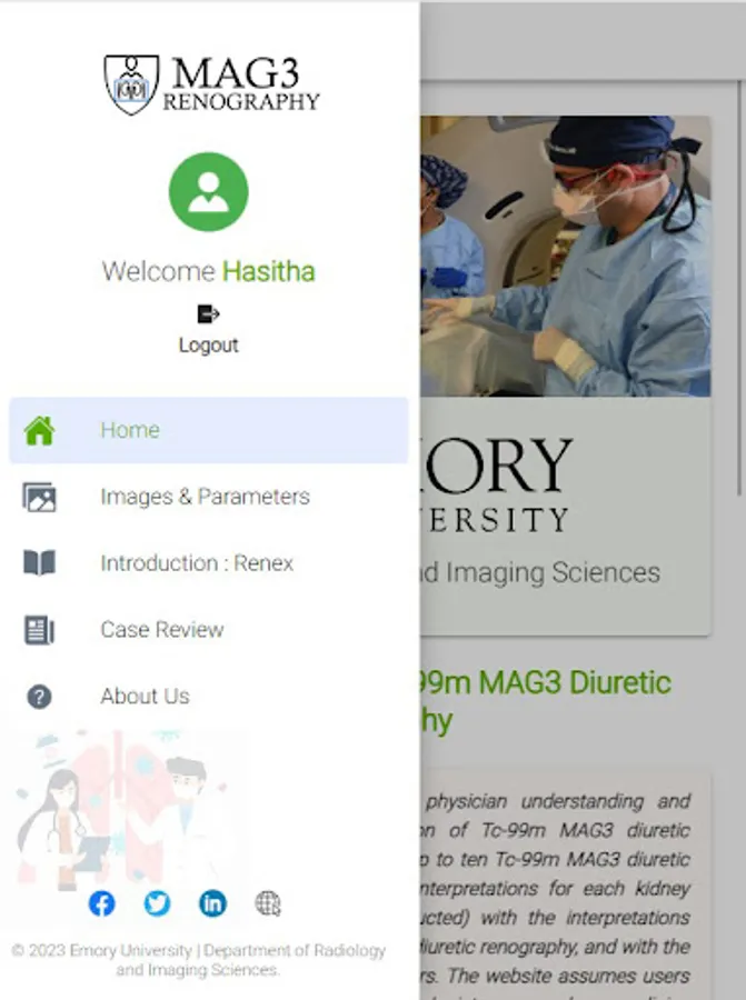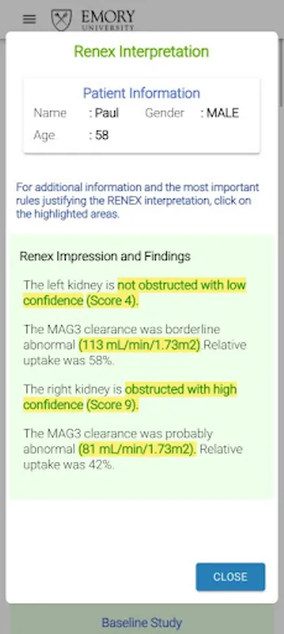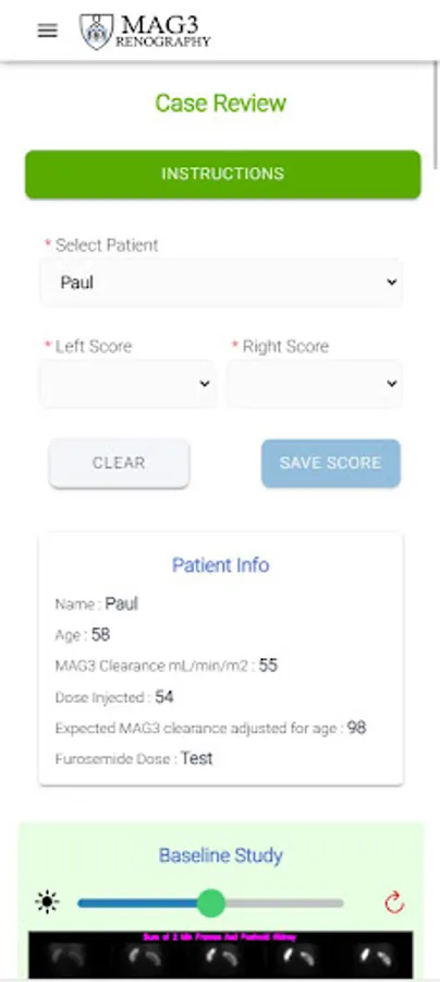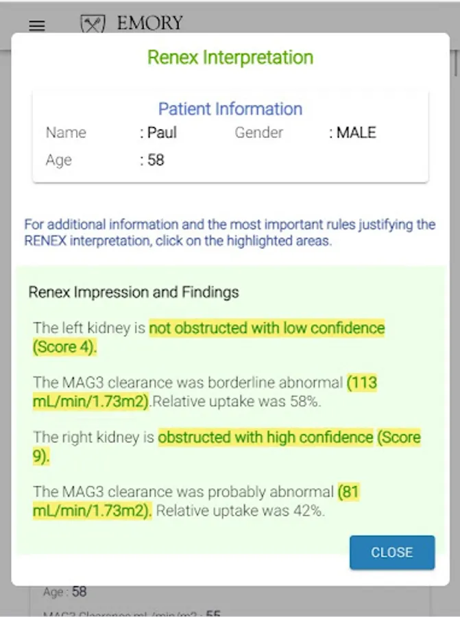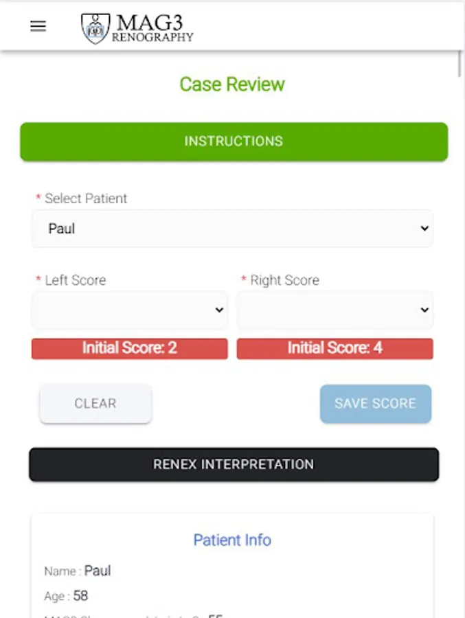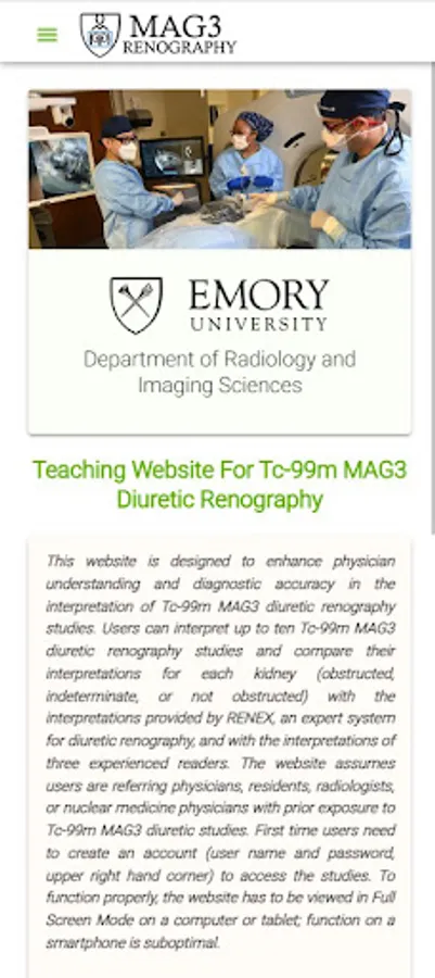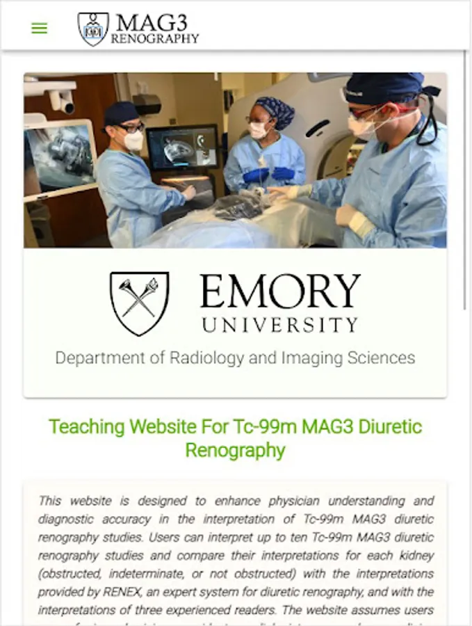 This application is designed to enhance physician understanding and diagnostic accuracy in the interpretation of Tc-99m MAG3 diuretic renography studies. Users can interpret up to ten Tc-99m MAG3 diuretic renography studies and compare their interpretations for each kidney (obstructed, indeterminate, or not obstructed) with the interpretations provided by RENEX, an expert system for diuretic renography, and with the interpretations of three experienced readers. The website assumes users are referring physicians, residents, radiologists, or nuclear medicine physicians with prior exposure to Tc-99m MAG3 diuretic studies. First time users need to create an account (user name and password, upper right hand corner) to access the studies. This educational application was developed because a large majority of the estimated 590,000 radionuclide renal scans performed annually in the United States are conducted at sites that perform fewer than 3 studies per week. Due to the relative infrequency of renal studies, some individuals may fail to acquire the expertise needed to provide a competent interpretation. Limited training and experience may discourage the use of the procedure, lead to incorrect scan interpretation and negatively impact patient care.