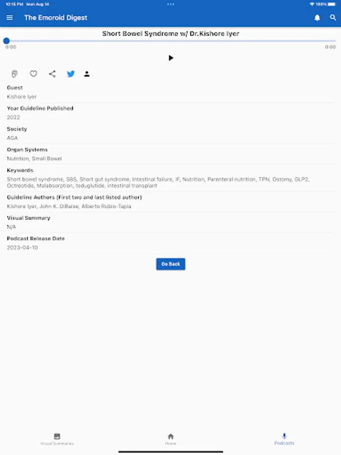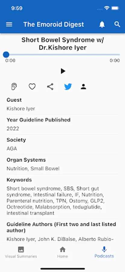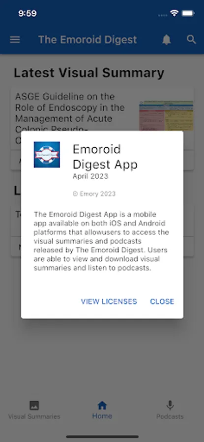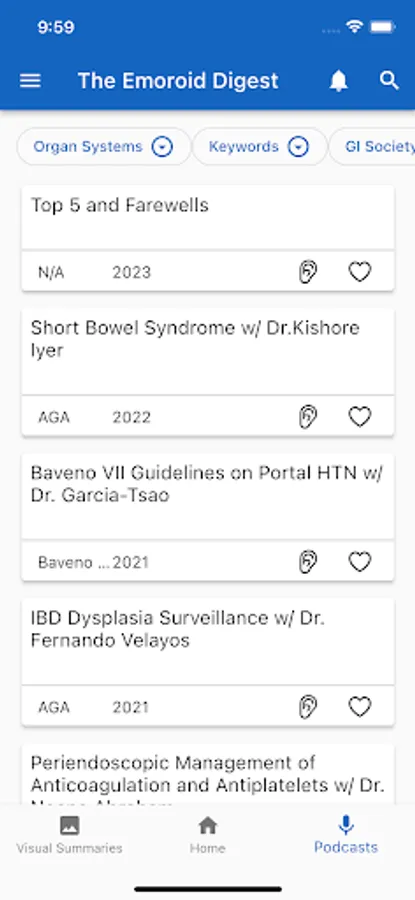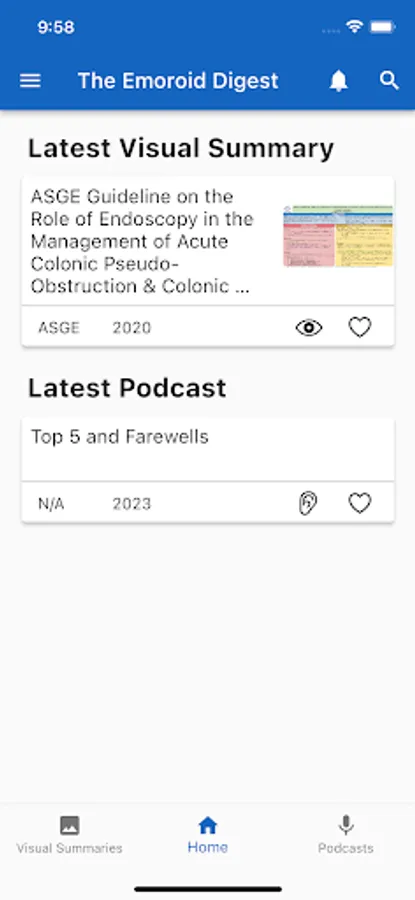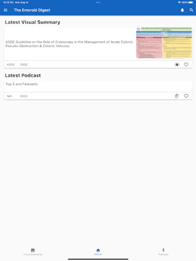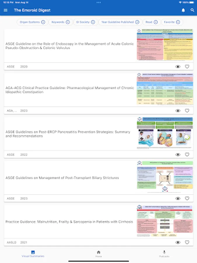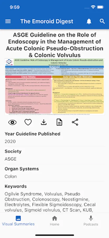 The Emoroid Digest App is a mobile app available on both iOS and Android platforms that allow users to access the visual summaries and podcasts released by The Emoroid Digest. Users are able to view and download visual summaries and listen to podcasts. This app helps doctors and practitioners in the field of gastroenterology to stay current with the latest guidelines and best practices released by various medical societies.