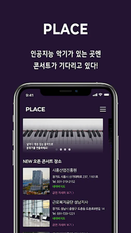 [Place] Shows places where artificial intelligence concerts are held, such as general companies, institutions, government offices, schools, academies, and public spaces. Visit the place where the AI concert is held through the place and create a fun time with music!