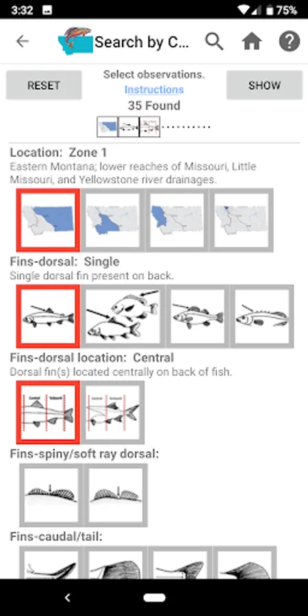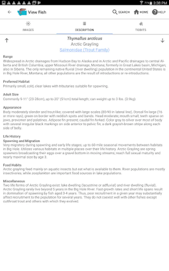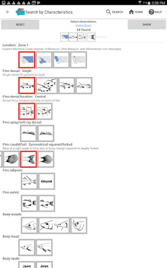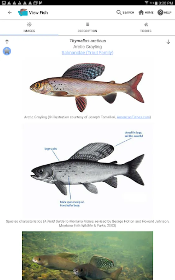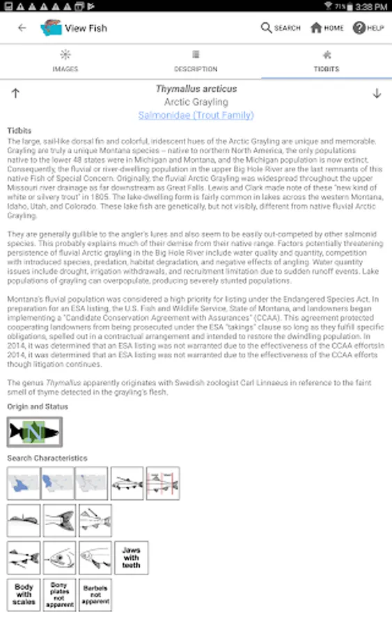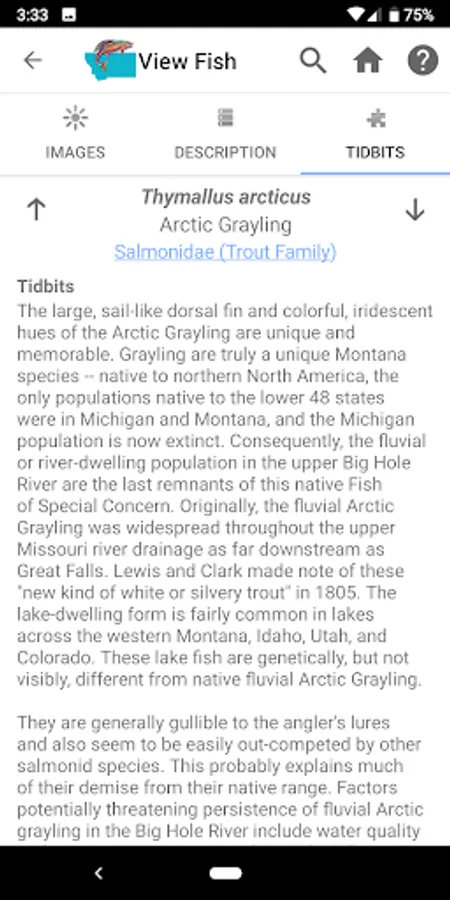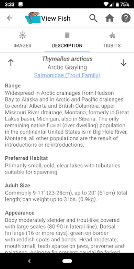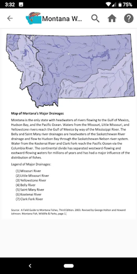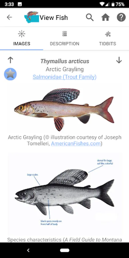 FISHES OF MONTANA is a collaborative effort between Montana State University's Department of Ecology, Montana Fish Wildlife & Parks, and MountainWorks Software. FISHES OF MONTANA provides an easy-to-use visual reference and interactive keys to the 90 species known to be found in the waters of Montana, and 10 Aquatic Invasive Species that we wish to keep out of Montana. A user can identify a fish visually by browsing through images of fish, search by name and family, or by using identifying characteristics such as fin structure, location of mouth, or geographical location. Each species is profiled to include images of the fish, range maps for both Montana and the U.S., preferred habitat, adult size, appearance, life history, similar species, and more!