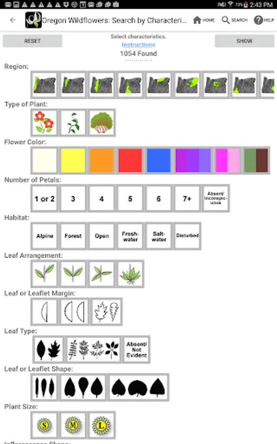 The key's interface allows users to select from twelve illustrated categories: geographic region, type of plant (e.g., wildflower, vine, shrub), flower features (flower color, number of petals, inflorescence shape, flowering month), leaf features (arrangement on plant, leaf type, leaf shape, leaf margin), plant size, and habitat. The key’s characters for each species are based on the descriptions prepared for the Flora of Oregon (published by OregonFlora at OSU).