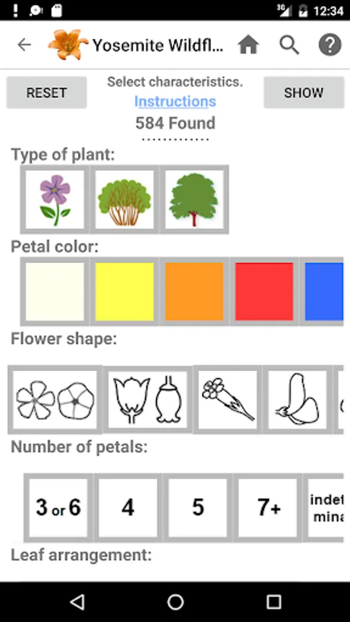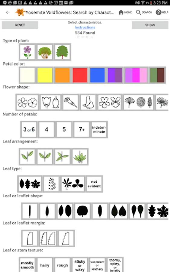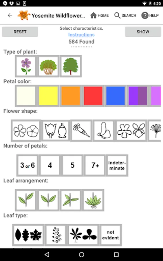 The search key consists of thirteen categories: type of plant (wildflower, shrub, or tree), petal color, flower shape, number of petals, leaf arrangement, leaf type, leaf shape, leaf margin, texture, size, habitat, vegetation zone, and flowering month. You can select characteristics in as many or as few categories as you want. As you make selections, the number of matching species is displayed at the top of the page. At any point, you can click the Show button to access a set of thumbnail images and names of plants that are potential matches. You can scroll through the species in the list and tap a thumbnail image to access photos, descriptions, and additional information for the selected species.