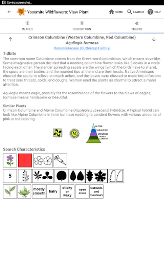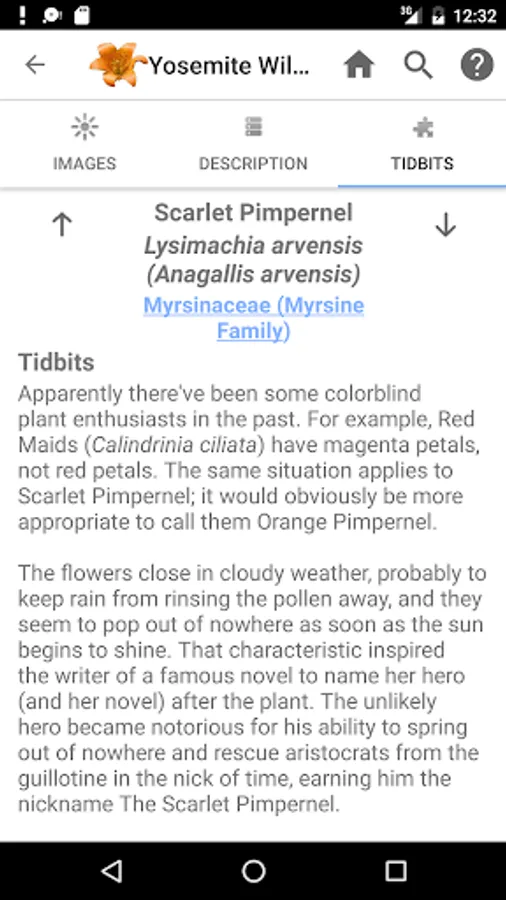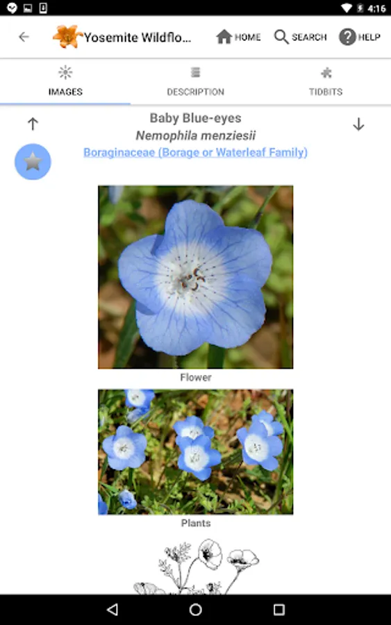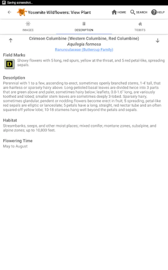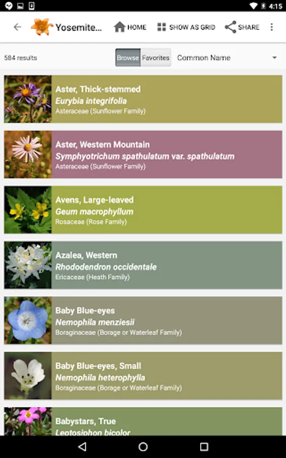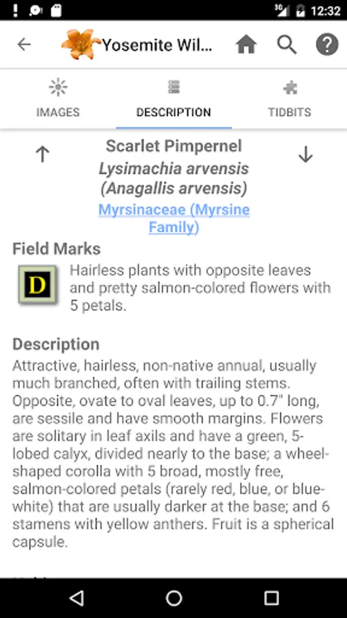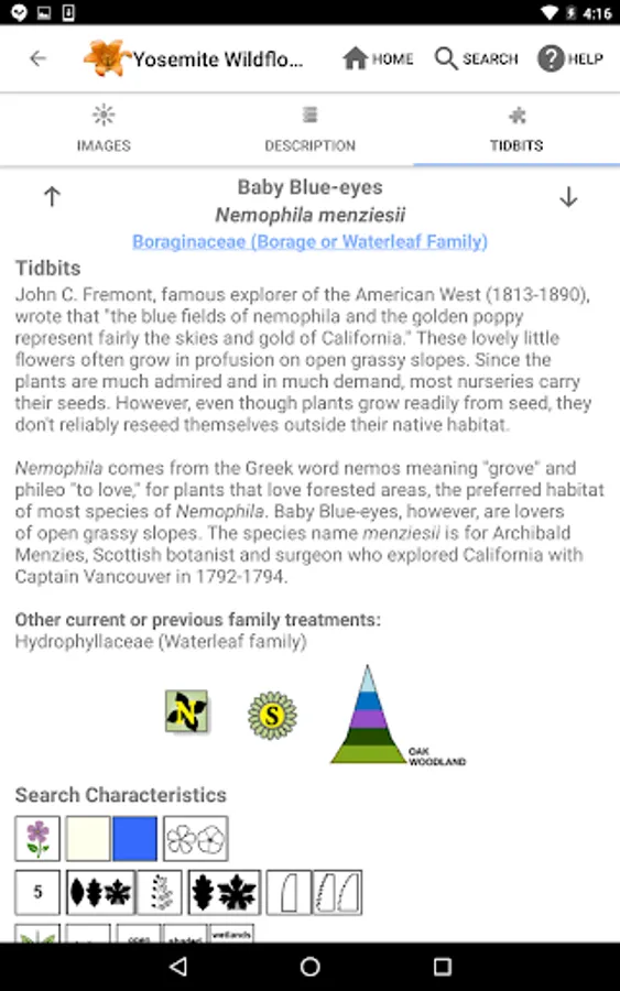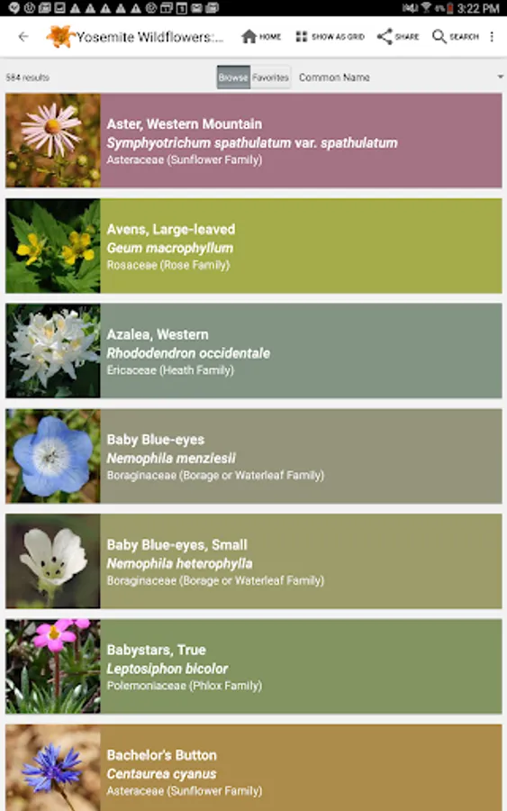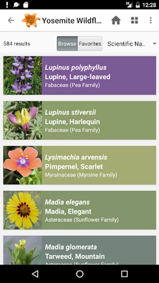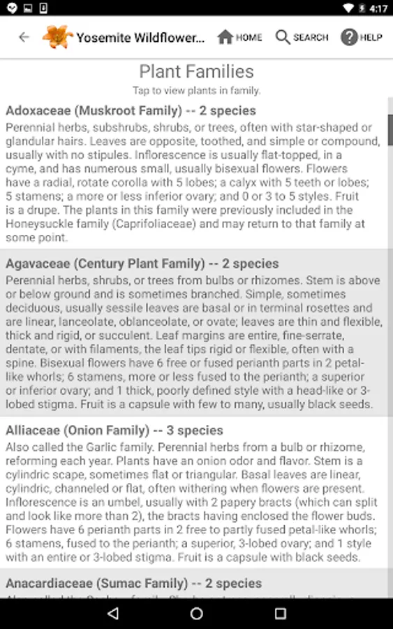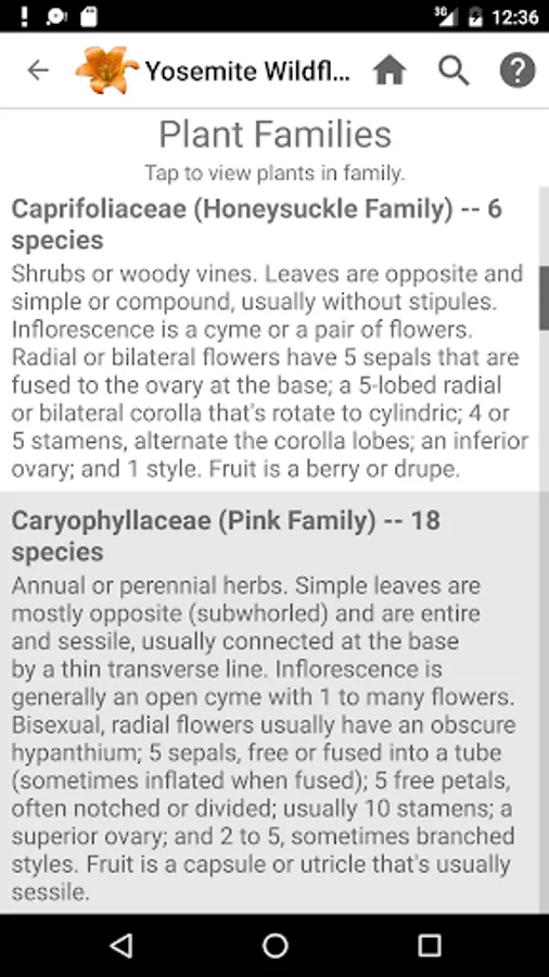 Although the app is designed to help amateur plant enthusiasts identify wildflowers, more experienced botanists will also value the app for its extensive content. Users can browse the species list by common or scientific name (and by family name ) to locate a plant and access photos and related information. However, most users will rely on the easy-to-use search key to identify plants of interest.