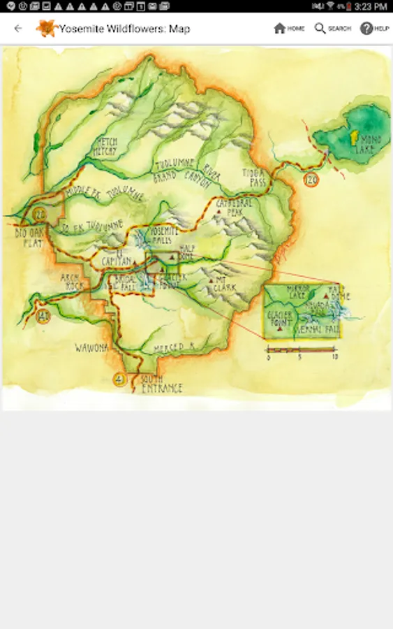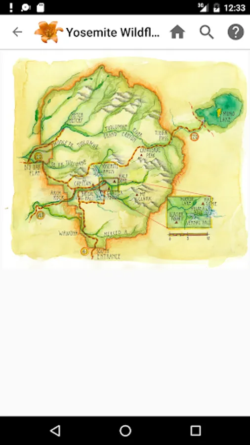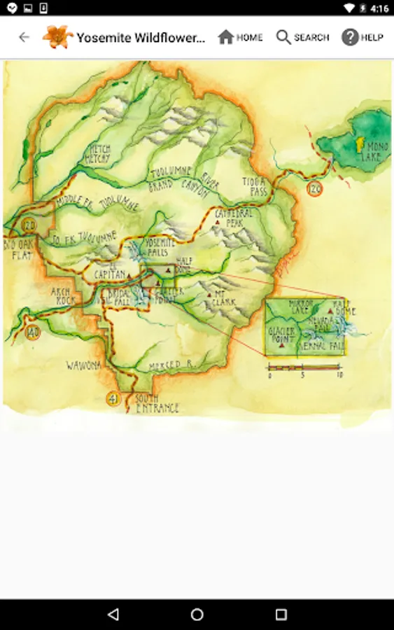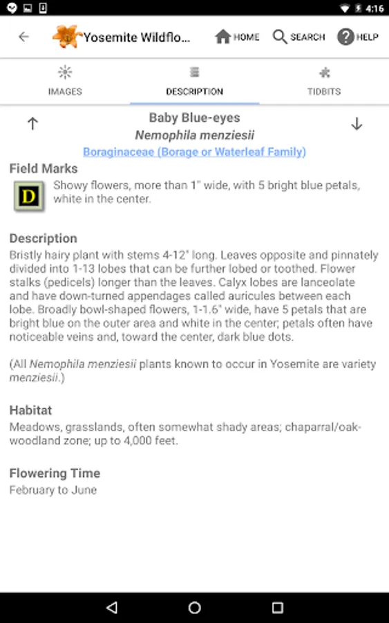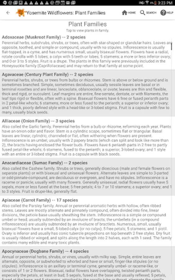 YOSEMITE WILDFLOWERS includes detailed instructions for using the app. It also has an extensive glossary of botanical terms; labeled diagrams of leaves, flowers, and inflorescences; and a description of each family represented in the app. You can tap a family name to access a set of images and names for all species in the app that belong to the selected family.