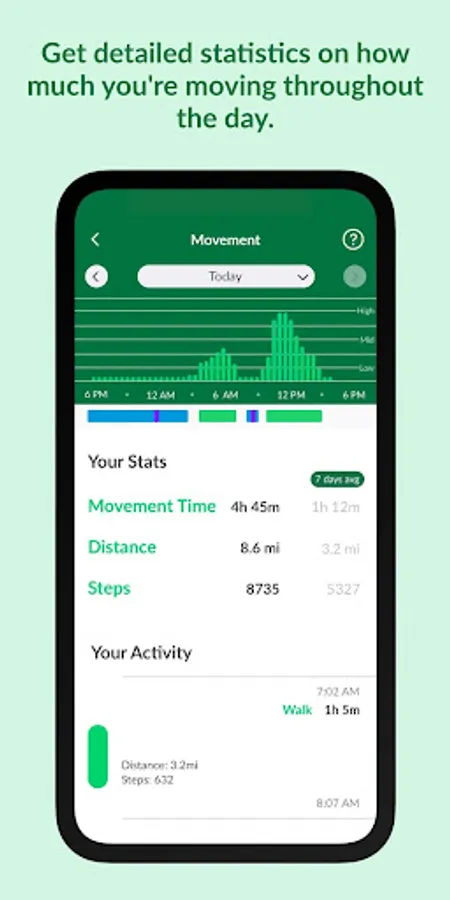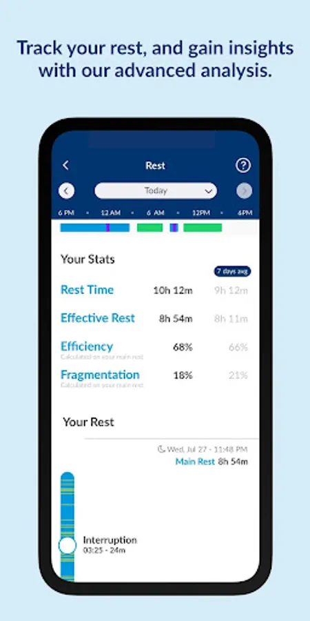• Discover insights about your rest: Get detailed stats such as duration, interruptions, turns and tosses. Advanced analysis lets you see how efficient your night's rest was, and compare it with your weekly average to identify patterns.
