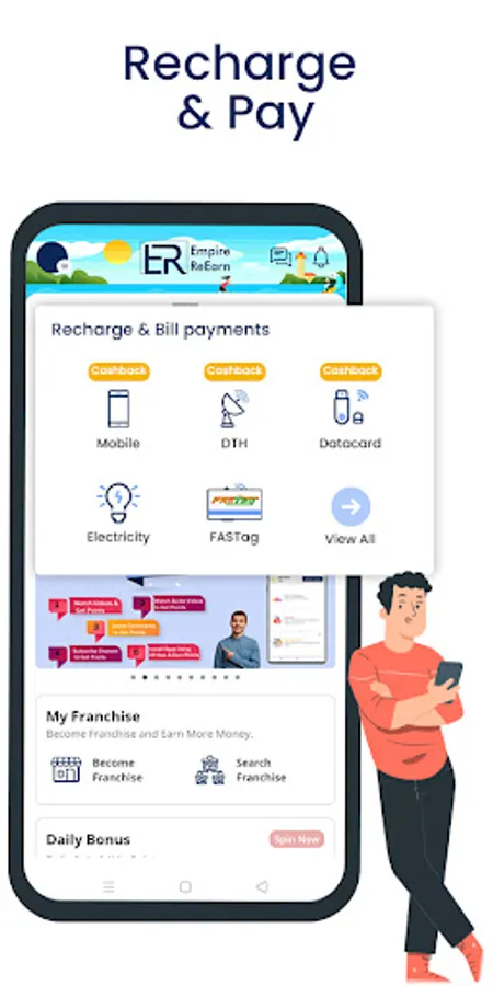 ER offers its services all over India. Online Recharge and Utility Payments can be done through Debit Card, Net Banking, Credit card, UPI, ER wallet with ease at Empire ReEarn app or Website.
