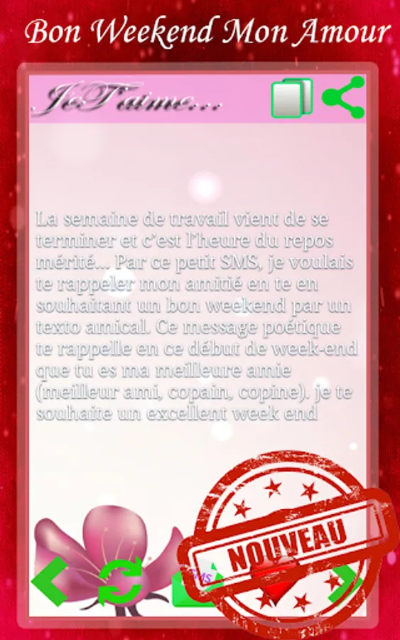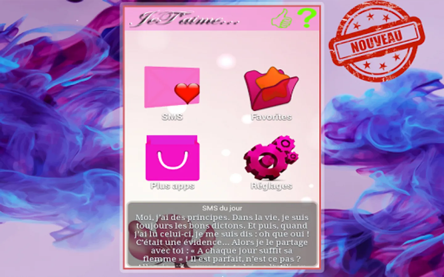 Express your feelings and send a little love in very soft French Message to your love has become very easy with this application, you no longer have to write SMS for your sweetheart, you just open the app, choose the message you want to send and hop done!