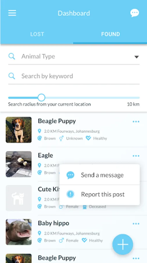 Listings can include the type of animal, the colour, the gender, the condition of the animal, the found location, and images and/or video.
