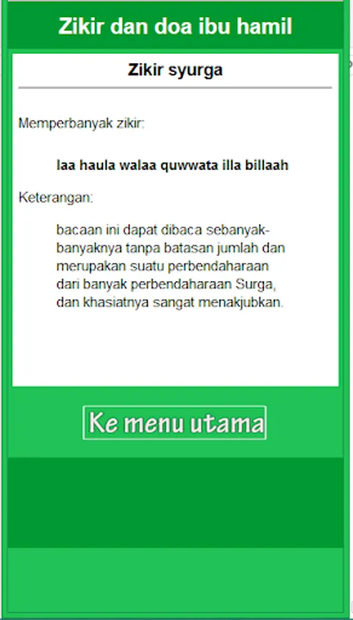 Prayers and wird pregnant women is also one of the tips during pregnancy, is taken from the Quran, the Hadith of the Prophet and of Atsar. Hopefully this little app handy and useful. Amen!
