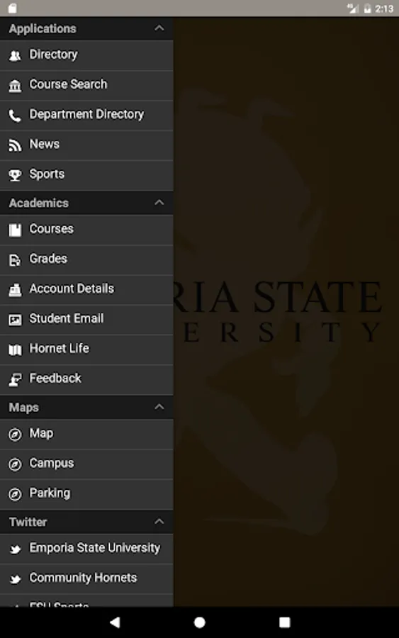 A mobile app specific for Emporia State University students, faculty, & staff. Included are features which will allow users to receive the latest ESU news, view the ESU faculty and staff directory, view Emporia and ESU maps. Additionally, for enrolled ESU students, the app includes capabilities which allow students to search course offerings, view their class schedule, check on their student account balances, and even view their grades, all through a secure login.