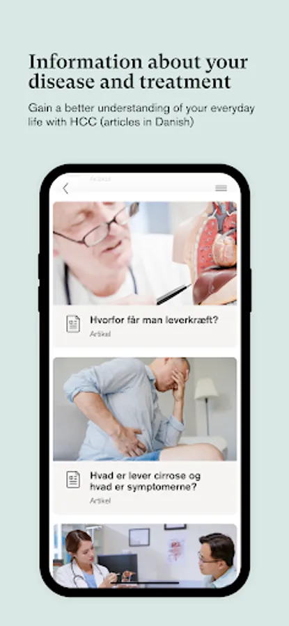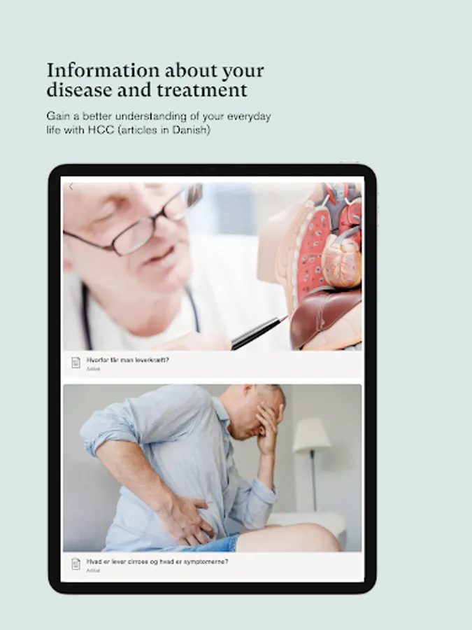 As a patient with HCC, you are welcome to use the patient support program and the HCC Patient app for free. The app is a support during your treatment and in it you receive information about your disease, common symptoms, and practical advice. We easily misplace paper, but not our mobile phones.