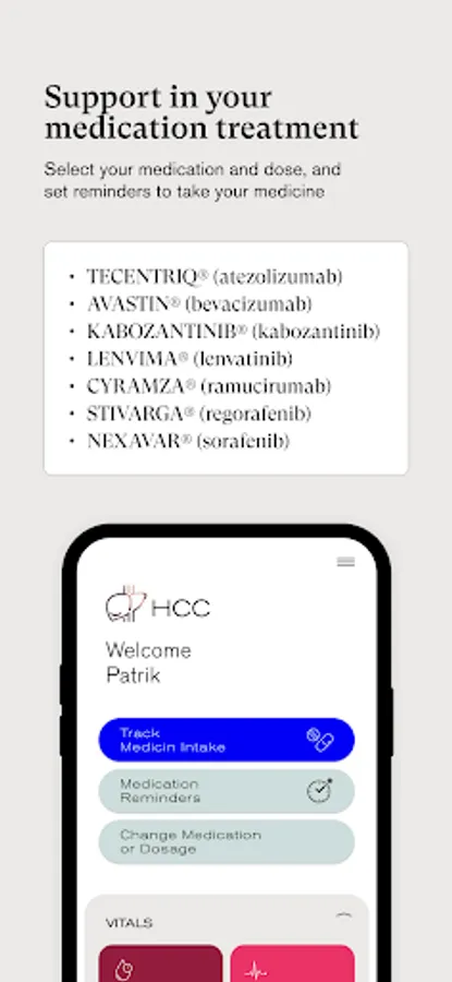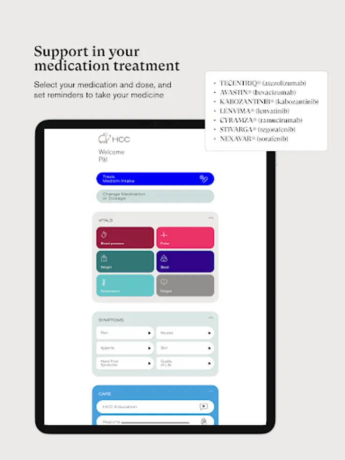 With the HCC Patient app, you will increase your knowledge about your disease and receive helpful tools to support your medication treatment and side effect management.