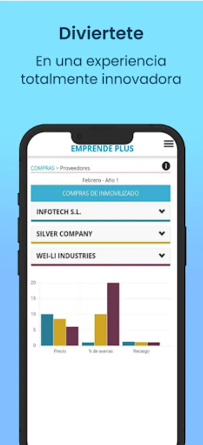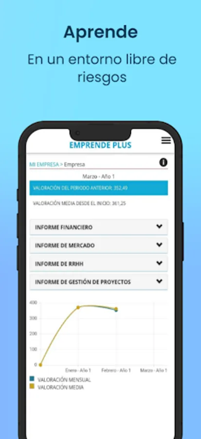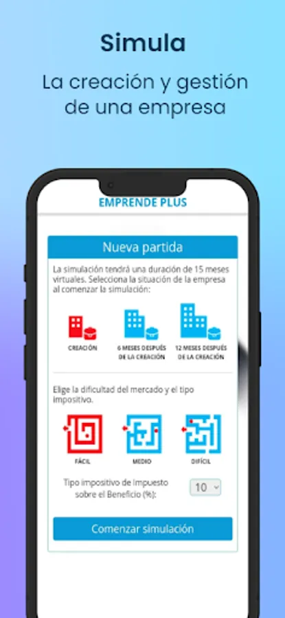 Emprende Plus is a complete and innovative entrepreneurship simulator with an excellent user experience. Thanks to this simulator you will be able to learn, while having fun playing with gamification, to create and manage your own company. The application uses a startup dedicated to the design and development of web pages as a practical case and offers three initial scenarios. These correspond to the phases of creation, consolidation (6 months of life) and growth (12 months of life). Each of these stages will offer three levels of difficulty: easy, medium and hard. The user will thus be able to access multiple options based on their knowledge and abilities, which will allow them to learn and improve as they progress through the game. In each of the possible scenarios and levels, the application offers all the necessary tools to manage the company, simulating the daily management of a technology company. At the end you will receive a detailed report to know your level of competence and identify your areas for improvement.