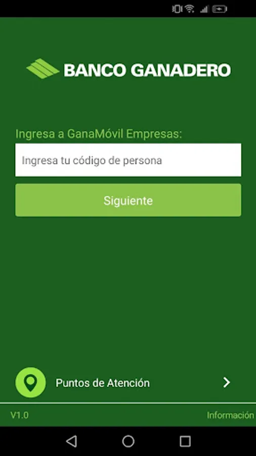 Once you have enabled your device, to enter the application you must use your person code and access code to the virtual bank GanaNet Empresas. Additionally, the screen will show your security image (the one you previously selected in GanaNet) and the date and time of the last access to your GanaMóvil Empresas.