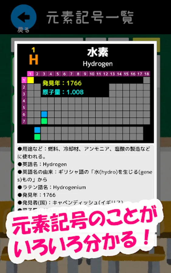 You can also see the position in the Periodic Table of the Elements, the purpose of the element, and the origin of the English name.