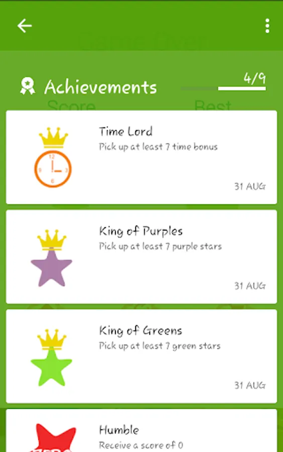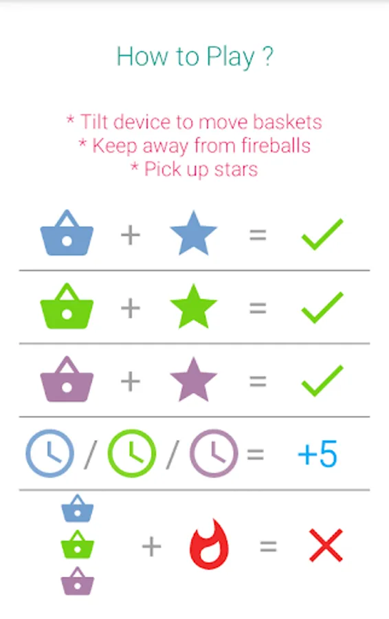 New & Well Designed Android Arcade Game Integrated with Google Game Services Including Leaderboards and Achievements. Catch green star with green basket, blue star with blue basket and purple star with purple basket. Try to collect time bonuses to increase playing time five seconds for each of them. Never touch any fireballs. Note that blue and green baskets move to the same direction while purple basket moves to the opposite direction. Set the sensitivity if you need.