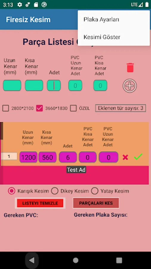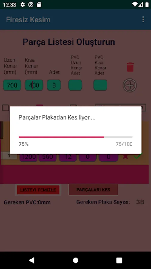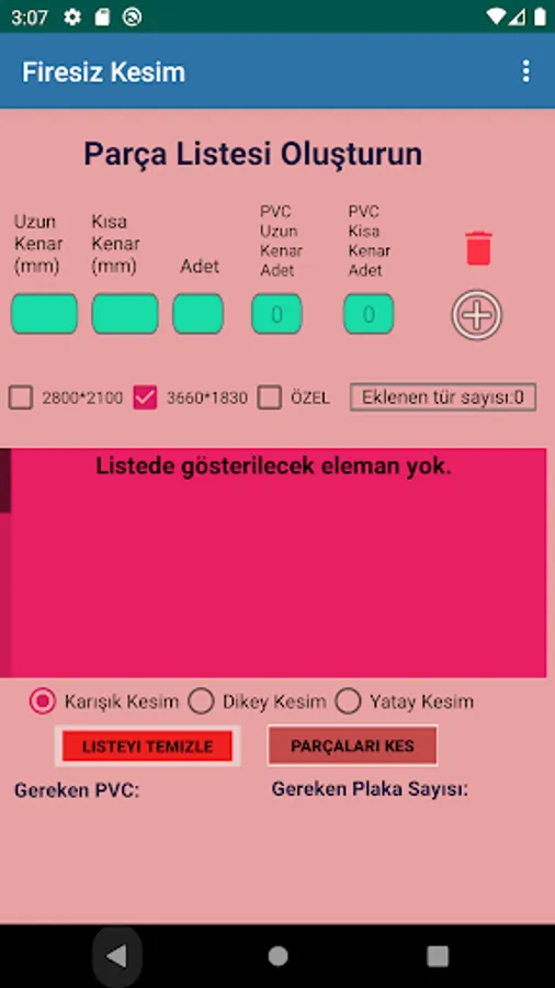 Track lengths; It is entered in the Long Edge (mm), Short Edge (mm) and Quantity sections and added to the list with the 'plus' icon on the right. For the PVC Long Edge and PVC Short Edge sections, the total number of edges to be PVC is entered. For example, if you want to cut 5 pieces out of 800 by 700 pieces and if you want to cover 8 long sides and 2 short sides of these 5 pieces, 8 and 2 values are relevant. That is, you should write the total number of edges you want to cover with PVC. The added elements will appear in the list below. With the 'cross' and 'tick' symbols in the list, you can delete the element or change the element settings (click).