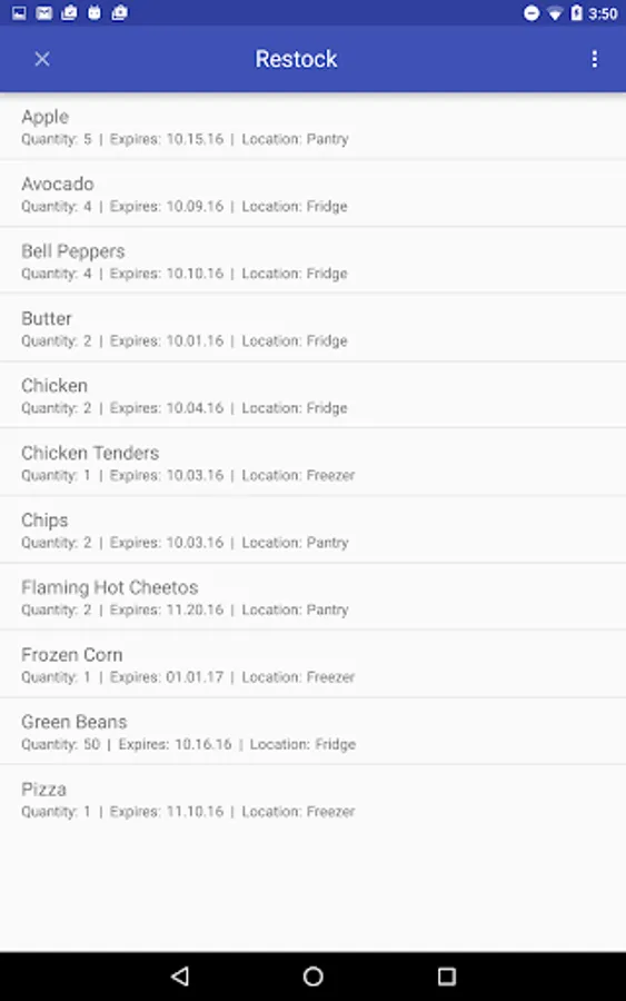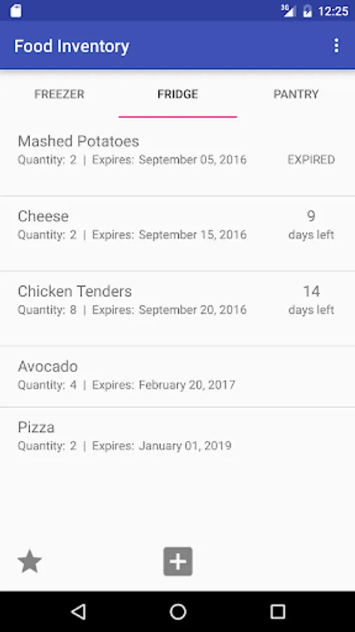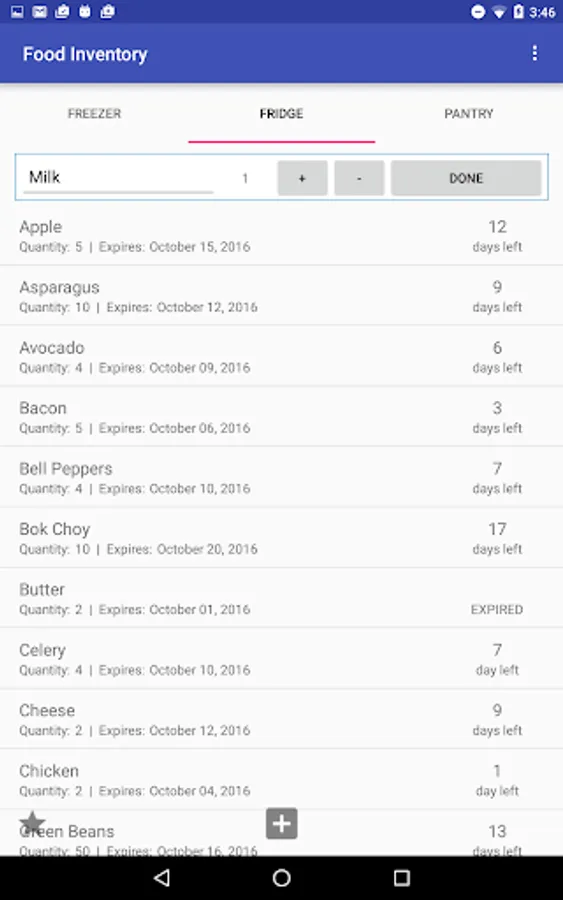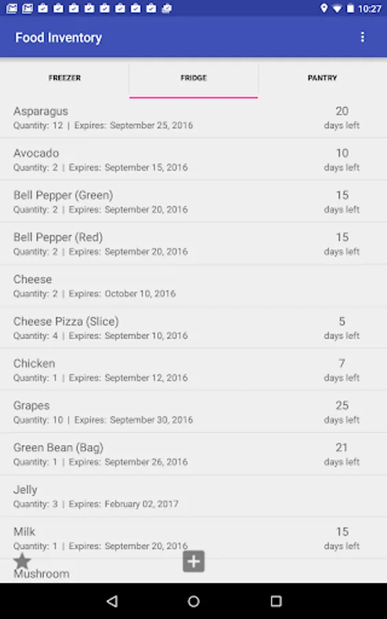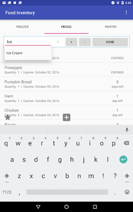 You can quickly add new foods to three different categories - the freezer, fridge, and pantry - and sort the inventories by closest expiration date to see which foods will expire the soonest.