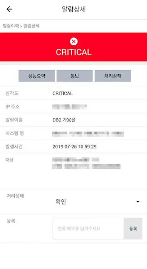 - Alarm detail: Detailed alarm, summary of performance, notification, registration of processing status, checking of processing status