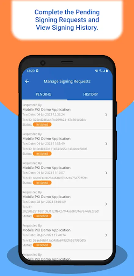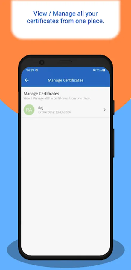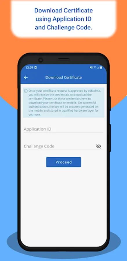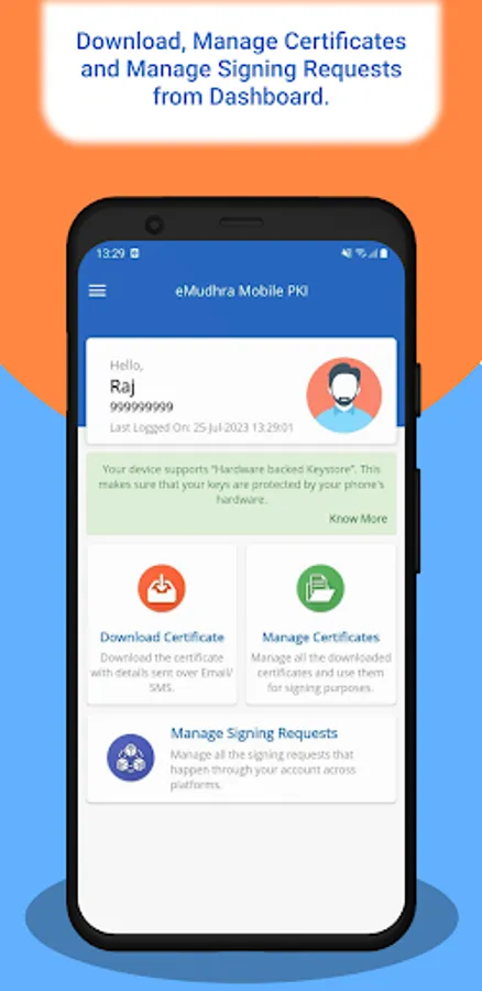 eMudhra Mobile PKI app enables users to download and store Digital Signature Certificates (DSC) on their phone and use it for signing/authentication purposes. This app helps users securely generate, store, and use their cryptographic keys in their mobiles. It generates and stores keys using hardware-backed storage on the mobile device. Keys can be accessed in a trusted execution environment by the application itself.
