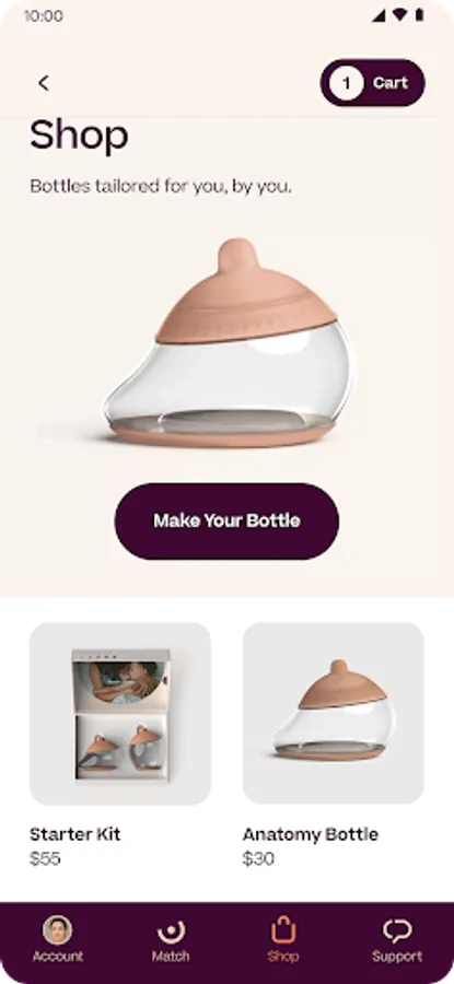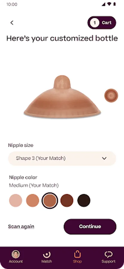 Making a bottle that is truly yours is easy with the new app. You can self-select, or pick from our selection of the most common options. With 5 nipple sizes, 5 skin tone colors, and 25 total variations possible, we have something just for you.