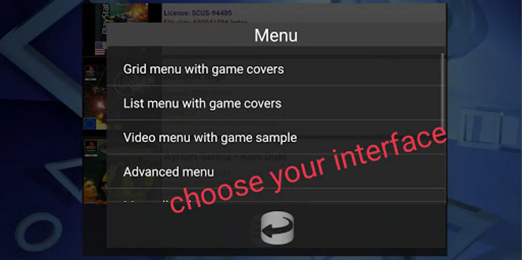 - Exceptional interface that automatically scans your local storage to find Psone games and automatically displays game covers: keep pressing the game icon to open its context menu