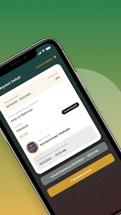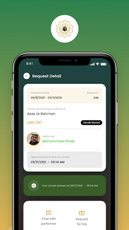 The application is a digital platform aimed at realizing the desire of many Muslim relatives men and women around the world who have not had the opportunity to perform the Umrah themselves for disability, illness, poverty or to perform Umrah on behalf of other deceased parents or, and this platform serves as a reliable digital medium from Mecca in the Land of the Two Holy Mosques. It connects service users and Umrah performers, who have been carefully selected and have qualifying courses under the supervision of the legal committee, by directly communicating through audio- visual application, and by enabling beneficiaries to see the agent through the activation of visual communication during the performance of Umrah.