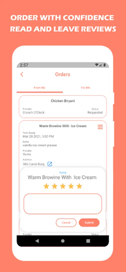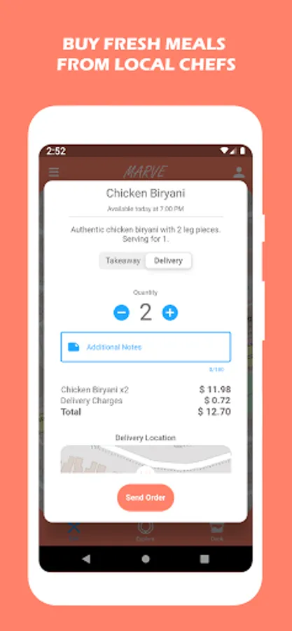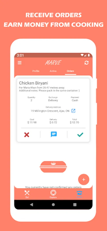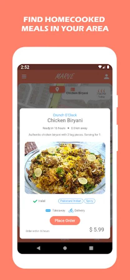 What if you're not in the mood to cook today? Or what if you're too busy? In that case, open Marve to see the meals in your surroundings that are being cooked today. If you're interested then place an order, and if the cook thinks they can fulfill your order then they'll accept the request and prepare your meal alongside their own.