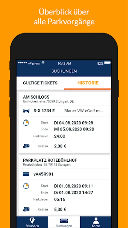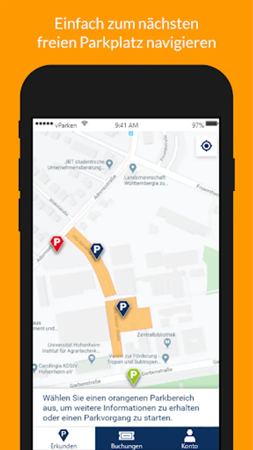 The vParken service is available for all PBW inner-city car parks in Stuttgart and Karlsruhe. In addition, all parking spaces belonging to the University of Hohenheim can be paid for with the vParken service.