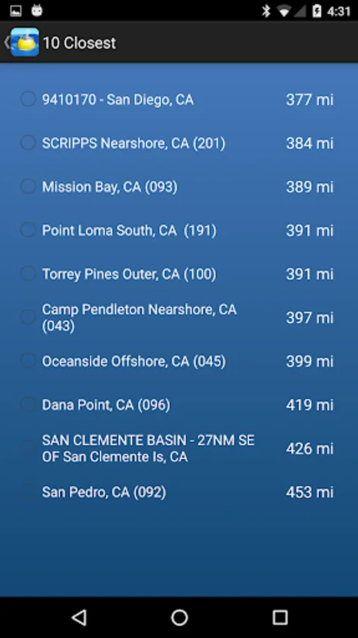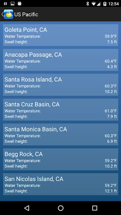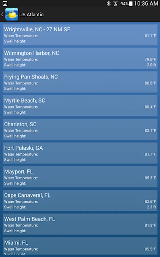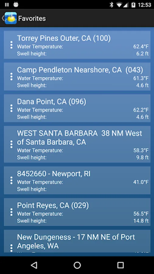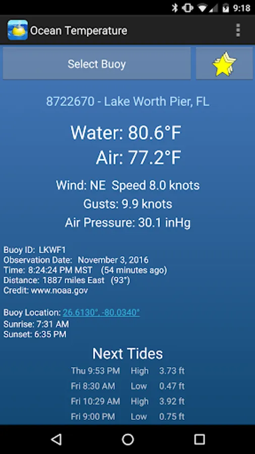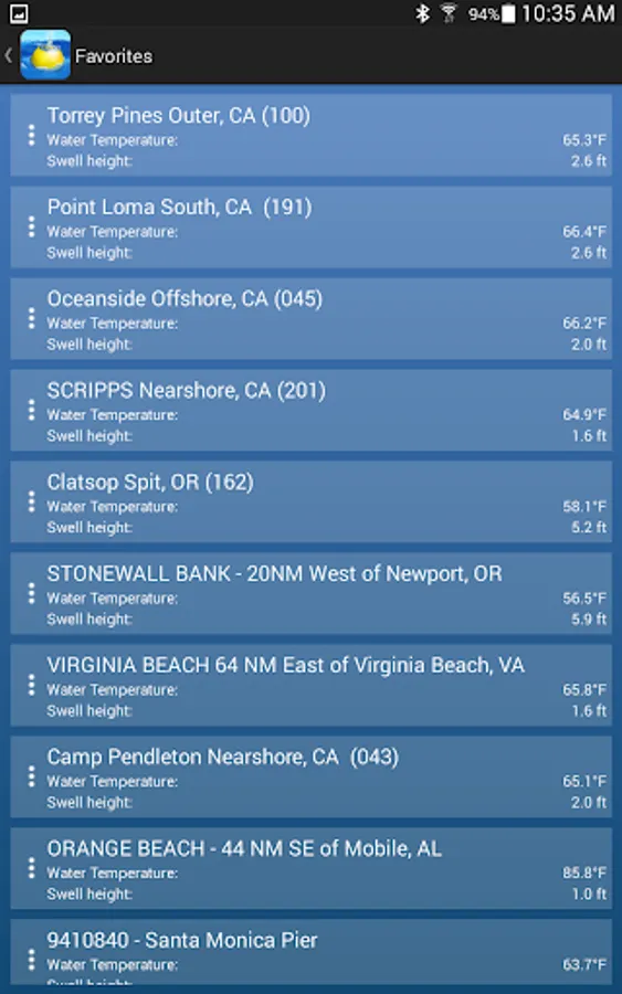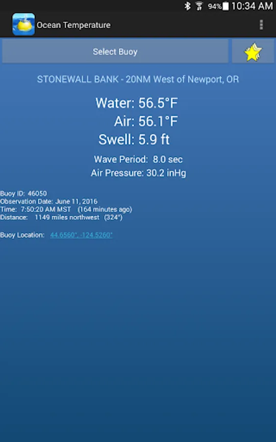 Live scientific readings from ocean buoys around the world. Data is provided by the National Data Buoy Center of NOAA and other public scientific organizations. Most buoys report water temperature and swell height, but some have more information available than others. Automatically select the closest buoy, choose one from the map, or choose from the list. Build a list of favorites for quick access to key buoys. With your device's location function turned on, bearing and distance to the buoy is calculated and displayed. This app is lightweight, easy-to-use, and requires virtually no data usage.