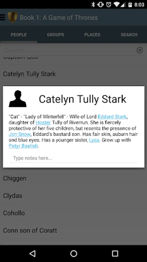 Get the ultimate guide for your "A Song of Ice and Fire" reading experience! This Reading Guide provides a huge collection of information on characters, places, groups, and more from George R.R. Martin's award winning series. Keeping track of hundreds of characters can be extremely difficult, but now you can check biographical information on anyone with just a single tap.