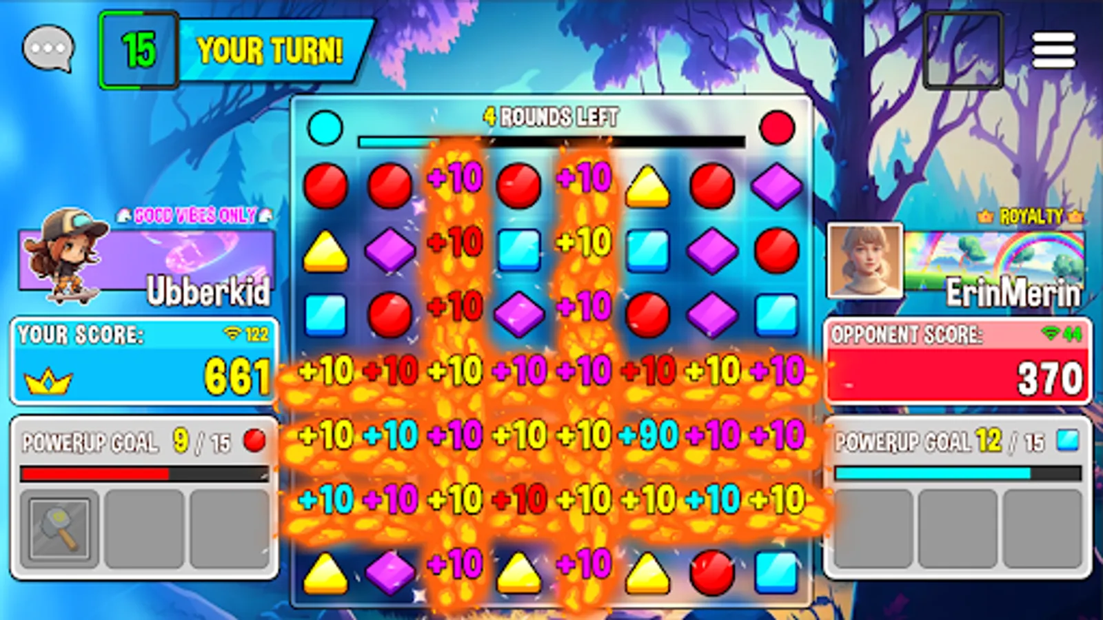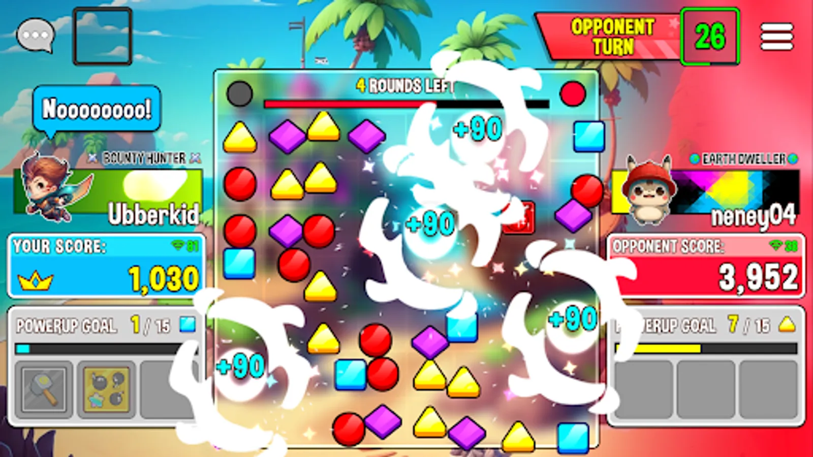 Destroying specific gems charges up your powerup meter, which, when fully charged, creates special powerups to be used against the opponent. Powerups stack, so use them strategically to win the match!