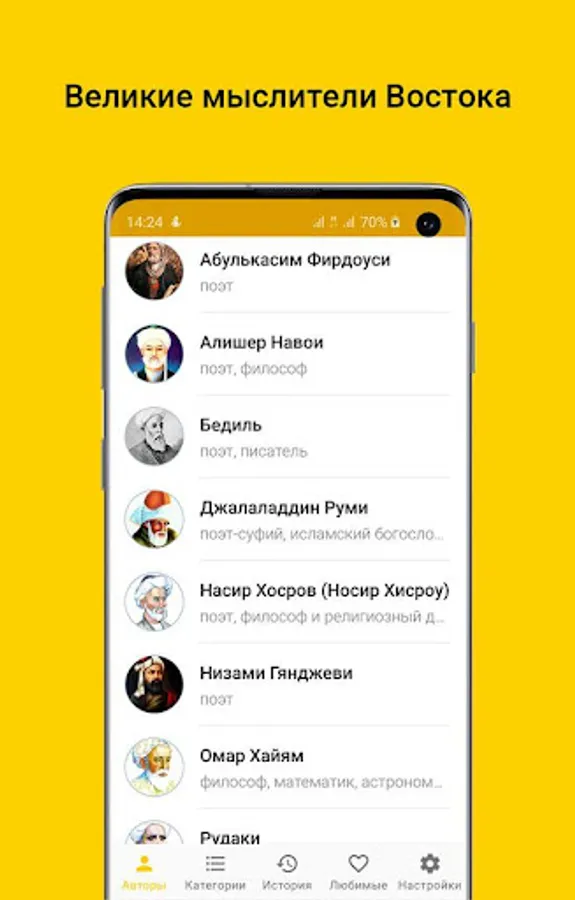 Omar Khayyam, Nizami Ganjavi, Hafiz Shirazi, Rudaki, Nasir Khosrov, Jalaladdin Rumi, Beddil, Alisher Navoi, Firdousi, Ibn Sina and Abdurrahman Jami are great poets and thinkers of the East. Their poems do not fade over time: after many centuries, their poetry retains its former strength.