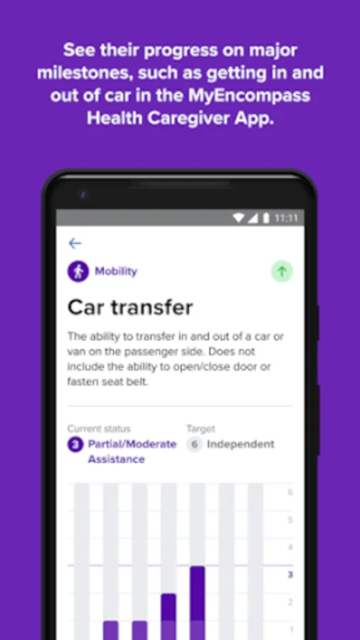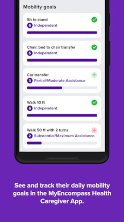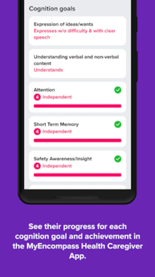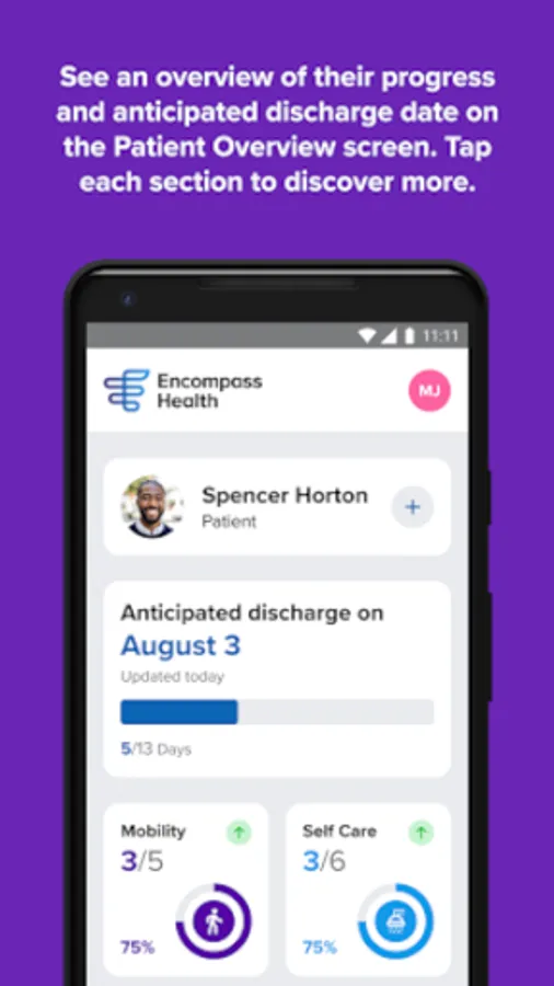 Encompass Health inpatient rehabilitation patients and their designated caregivers have the option to use the MyEncompass Health Caregiver application to follow along with a patient’s rehabilitation program. The app shows a patient’s real-time progress toward their goals and an overview of their care plan in a secure manner.
